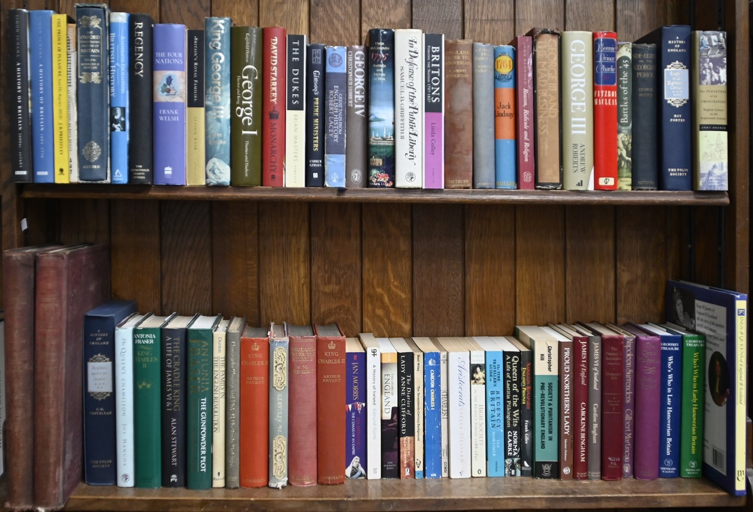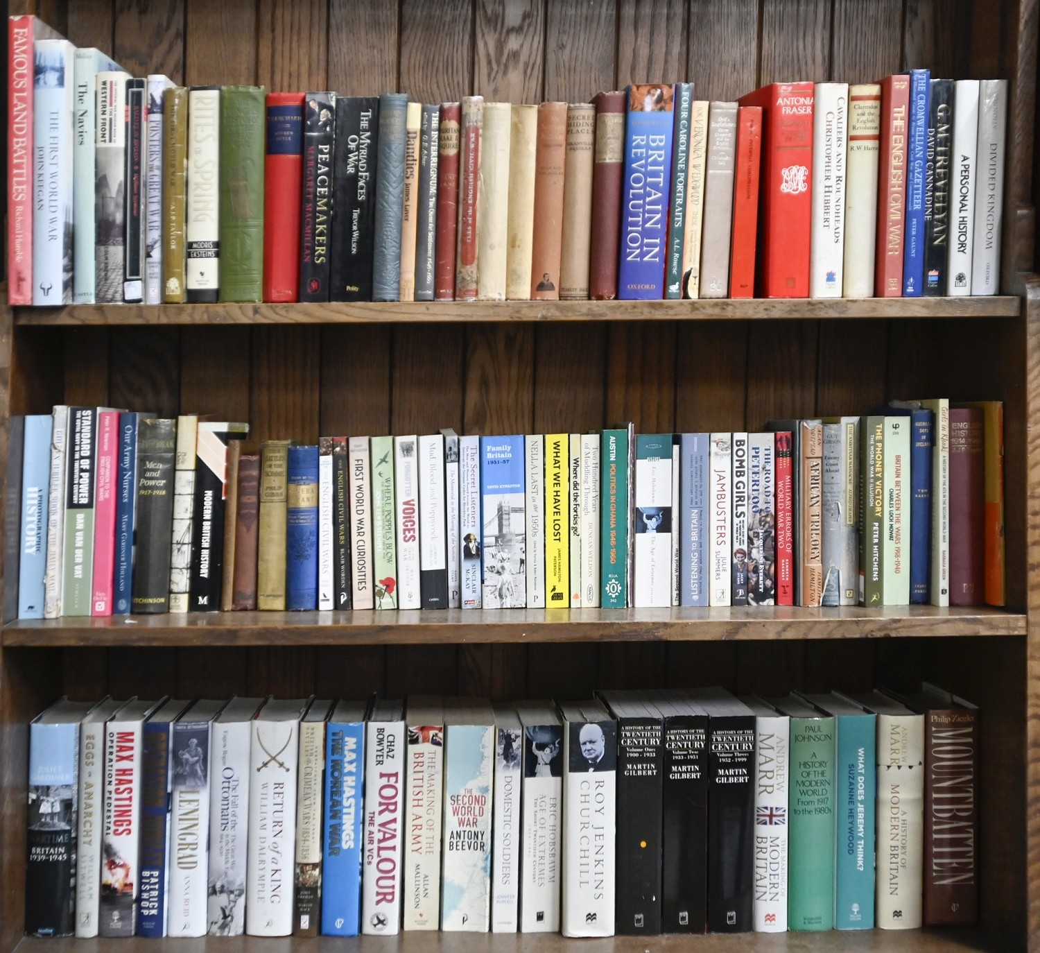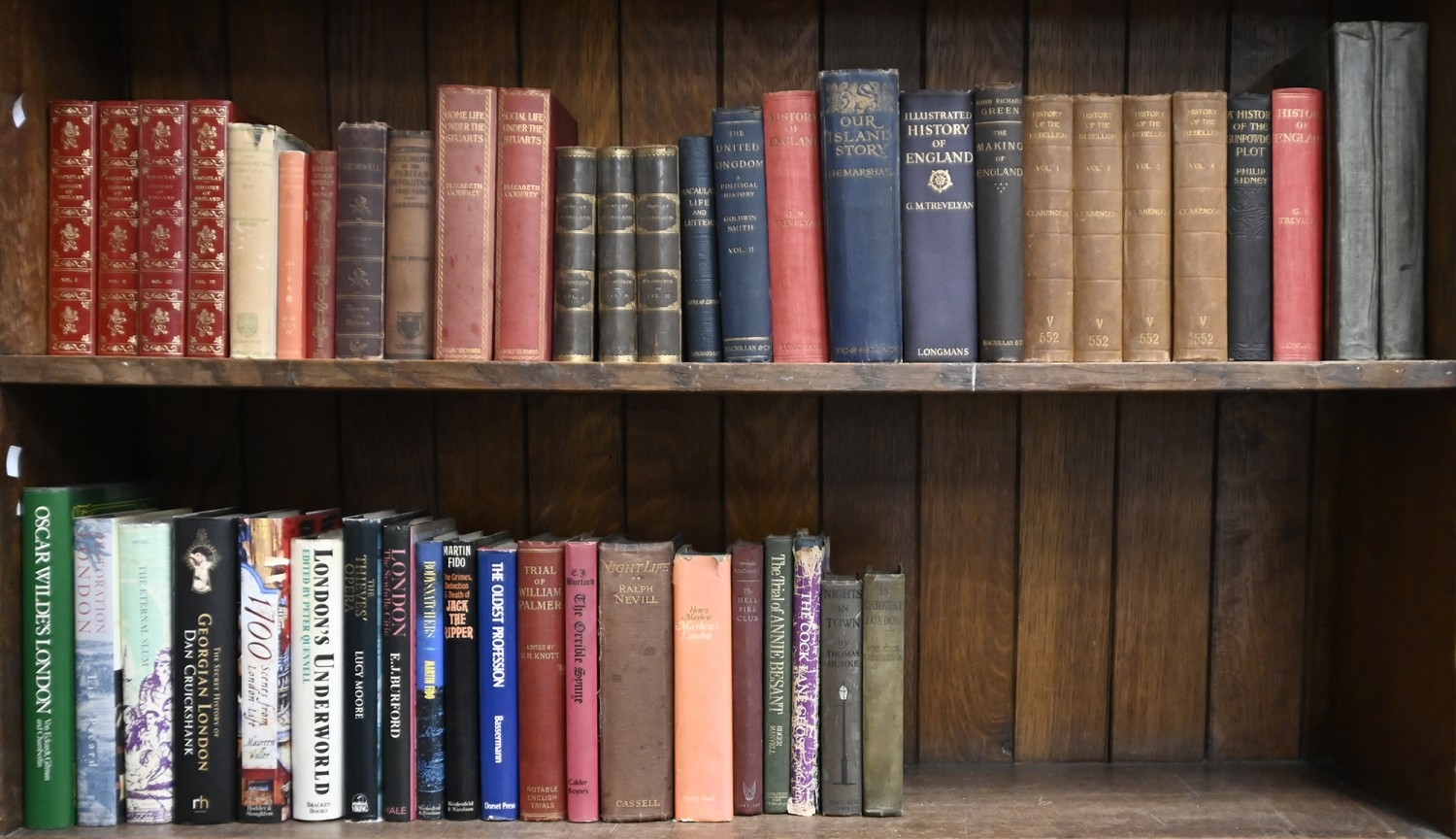 Books. Six and a half shelves of history, 19th c and later, comprising one shelf of vice and crime, Nevill's Night Life, 1926, Jack the Ripper, William Palmer and other murders; Knight's Old England, two volume set, London: James Sangster and Co., n.d. [1844], plates, original publisher's bindings, folio; Jacobean, Georgian, and Modern British history, including Empire, World War Two, Civil War, etc., Folio Society, mixed bindings and sizes