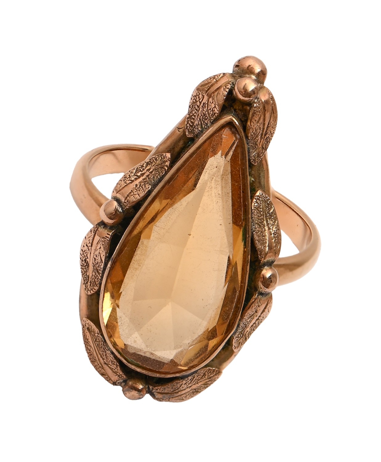 A pear-shaped citrine ring, in gold, on an associated gold hoop marked 9ct, 4.9g, size L