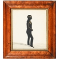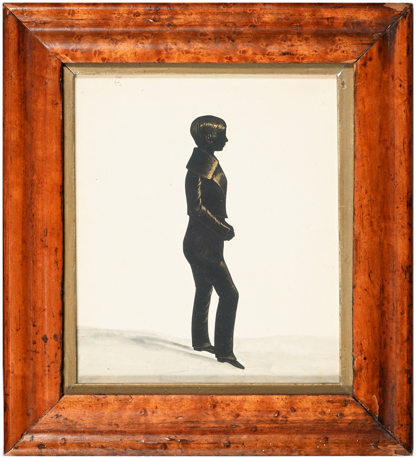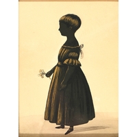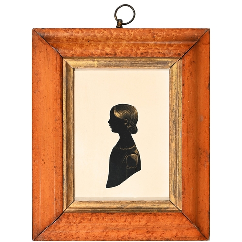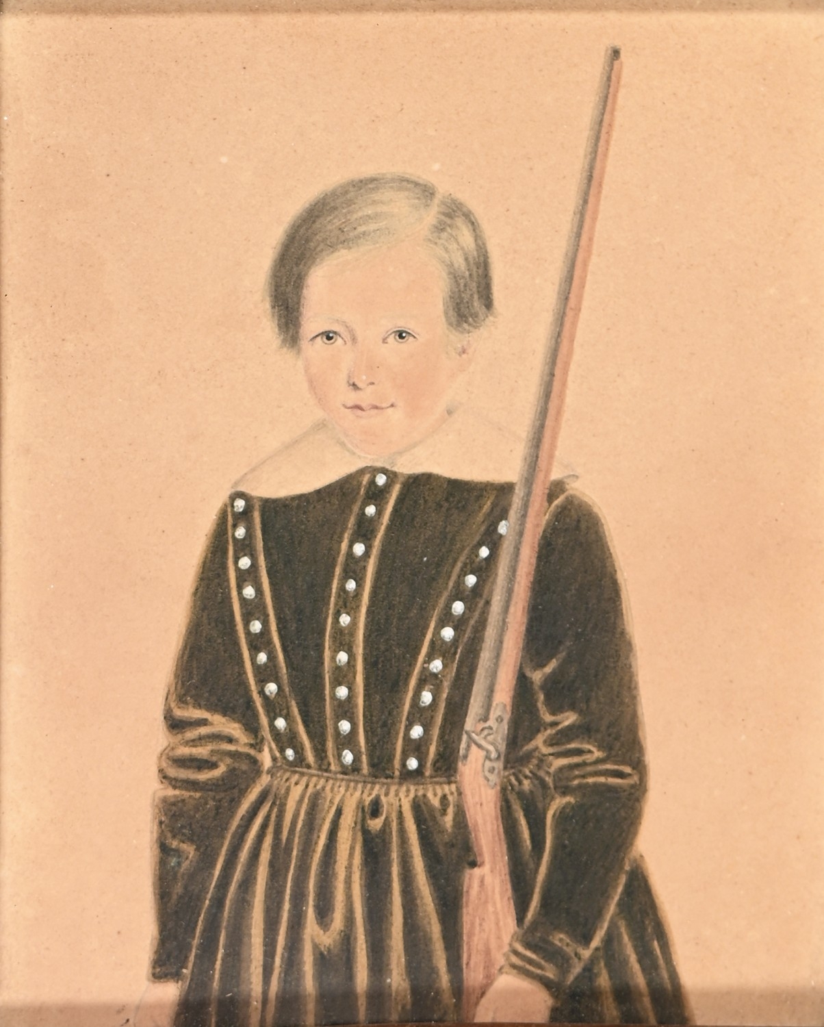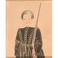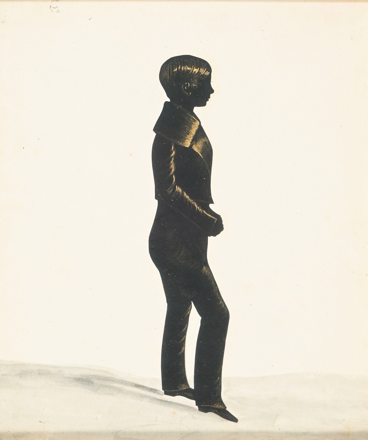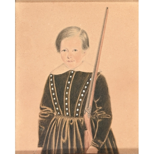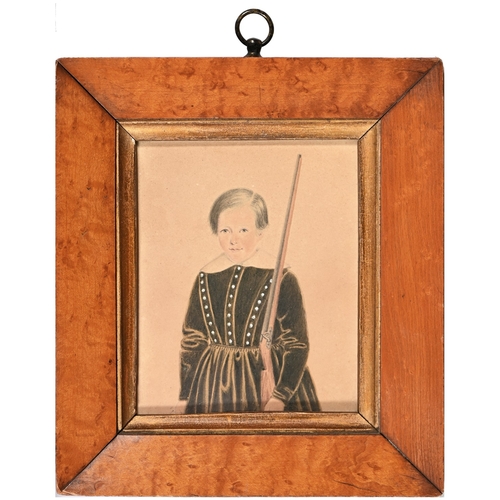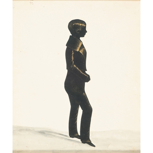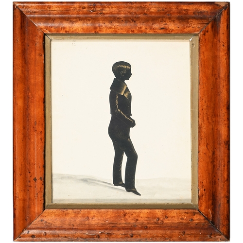 English School, mid 19th century - Portrait of a Boy, three quarter length in Tudor dress and bearing a gun, watercolour, 12 x 10cm and two contemporary silhouettes of a girl and boy, each in maple frame (3)