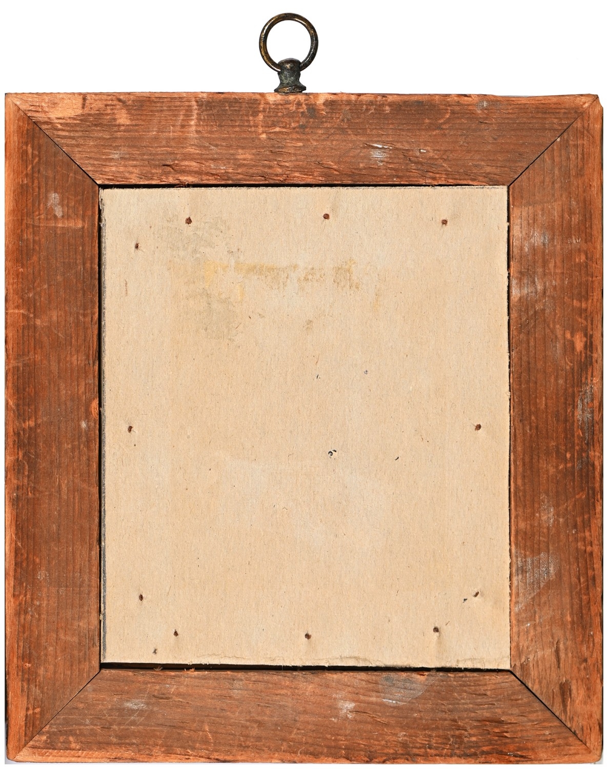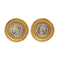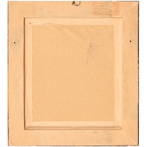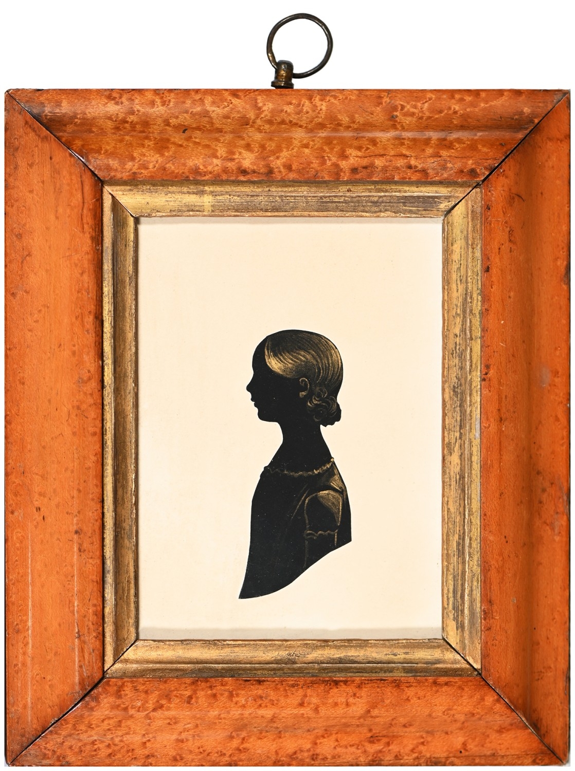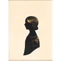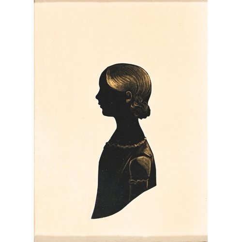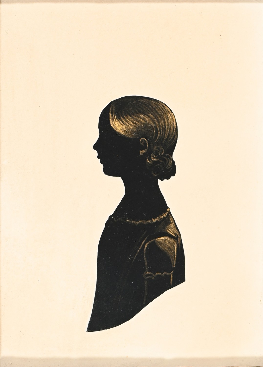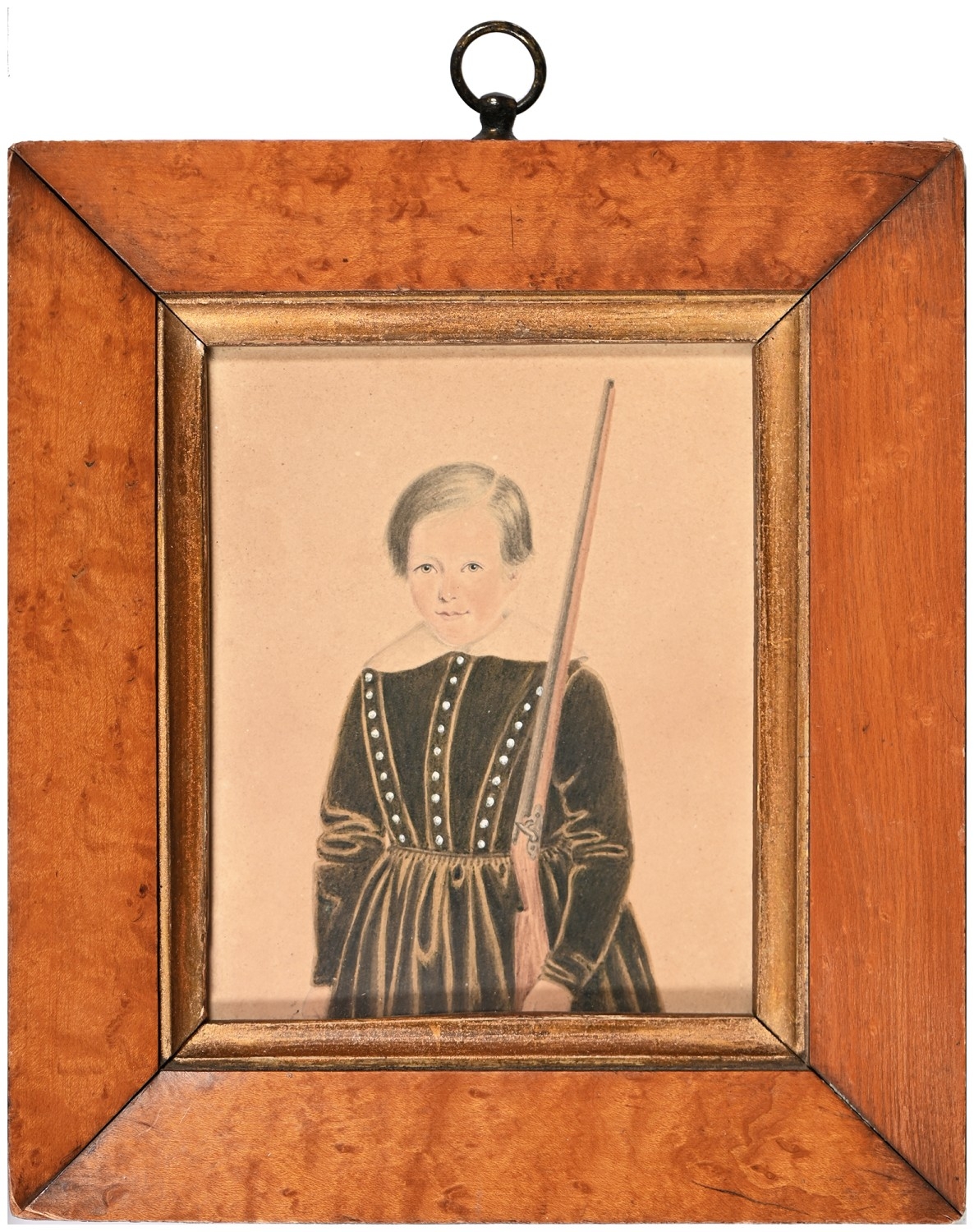 English School, mid 19th century - Portrait of a Boy, three quarter length in Tudor dress and bearing a gun, watercolour, 12 x 10cm and two contemporary silhouettes of a girl and boy, each in maple frame (3)