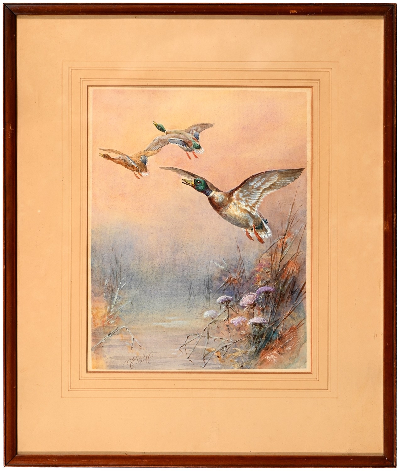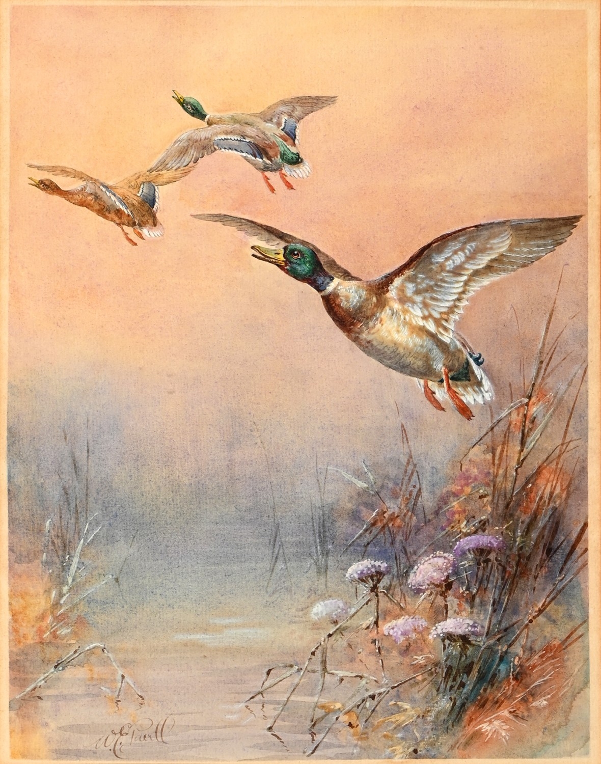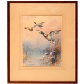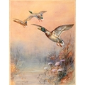 William E. Powell (Royal Worcester Artist; 1878-1955) - Mallards in Flight, signed, watercolour and gouache, 28.5 x 22.5cm