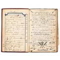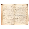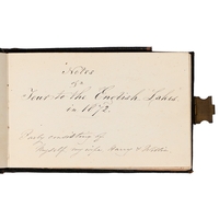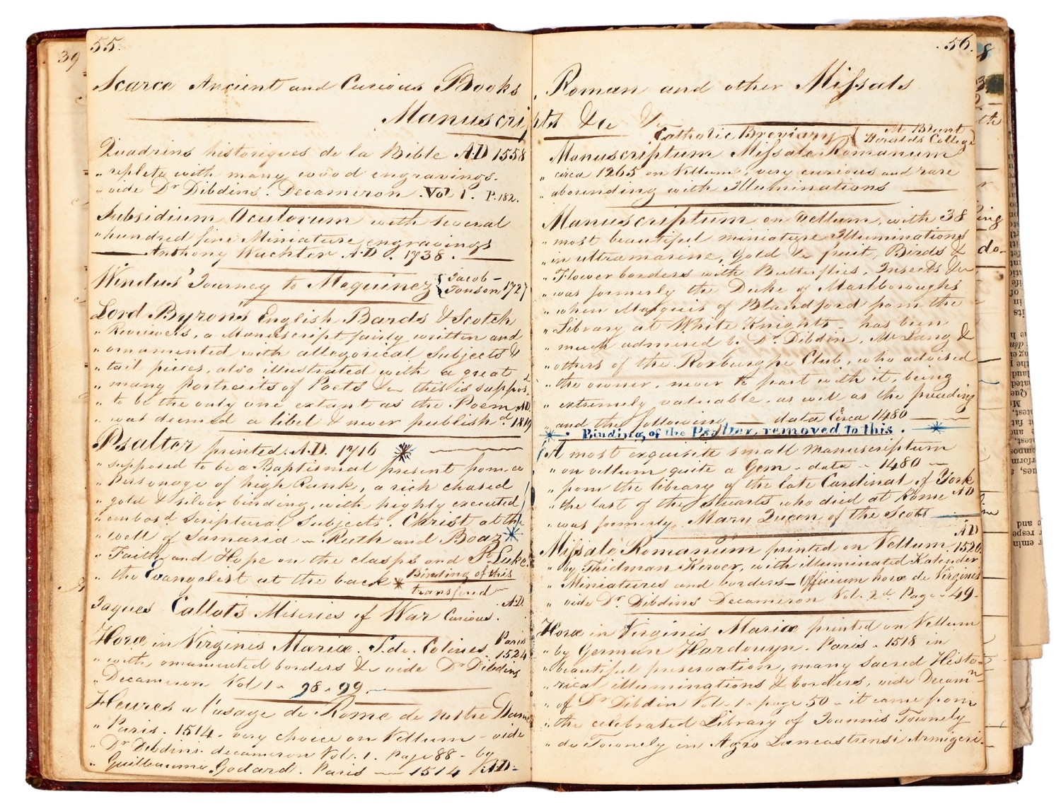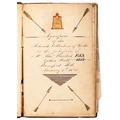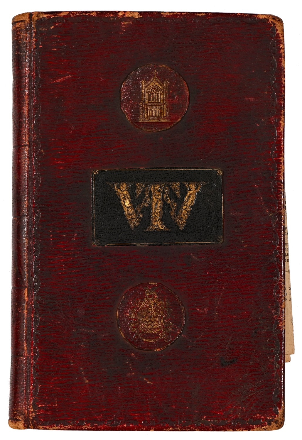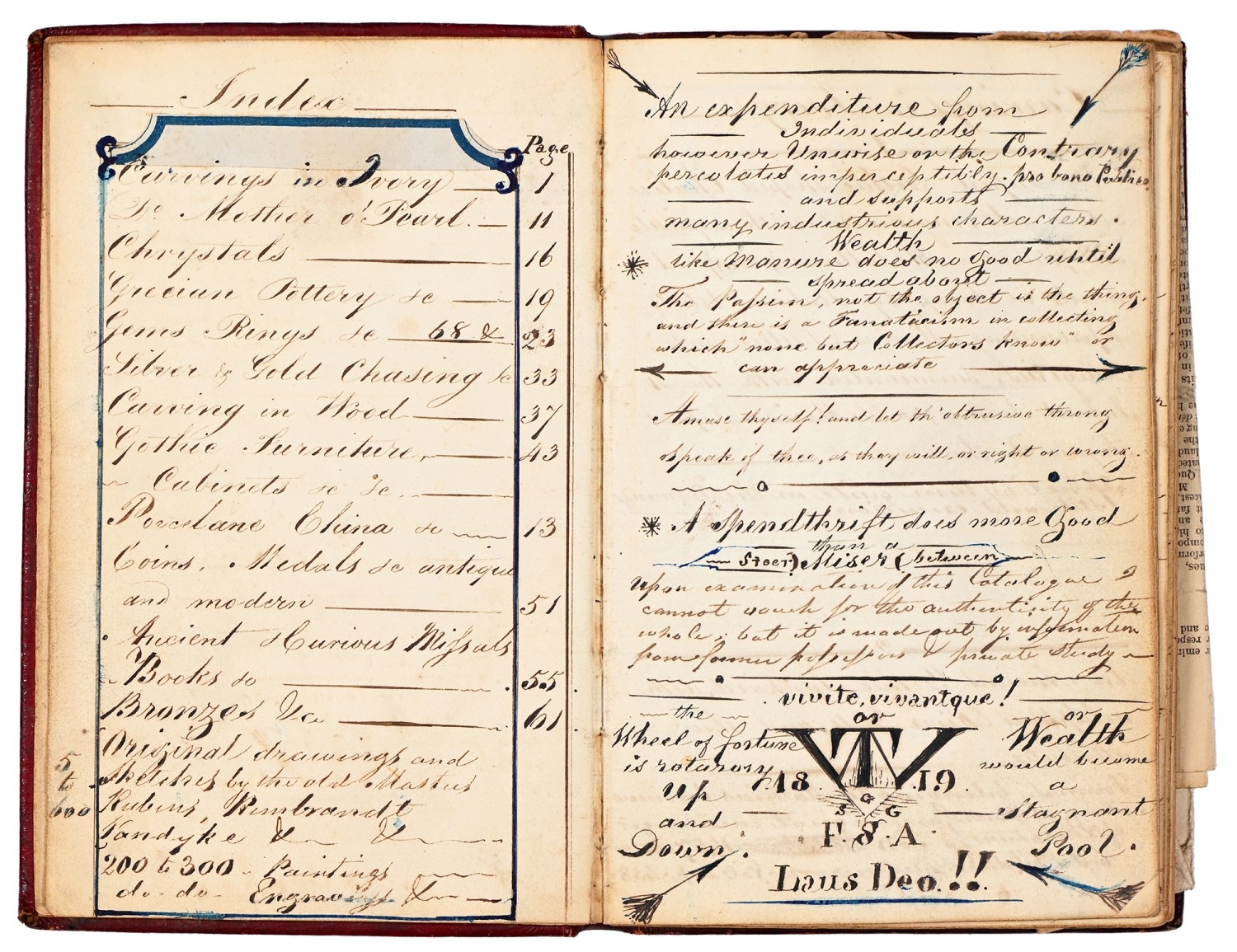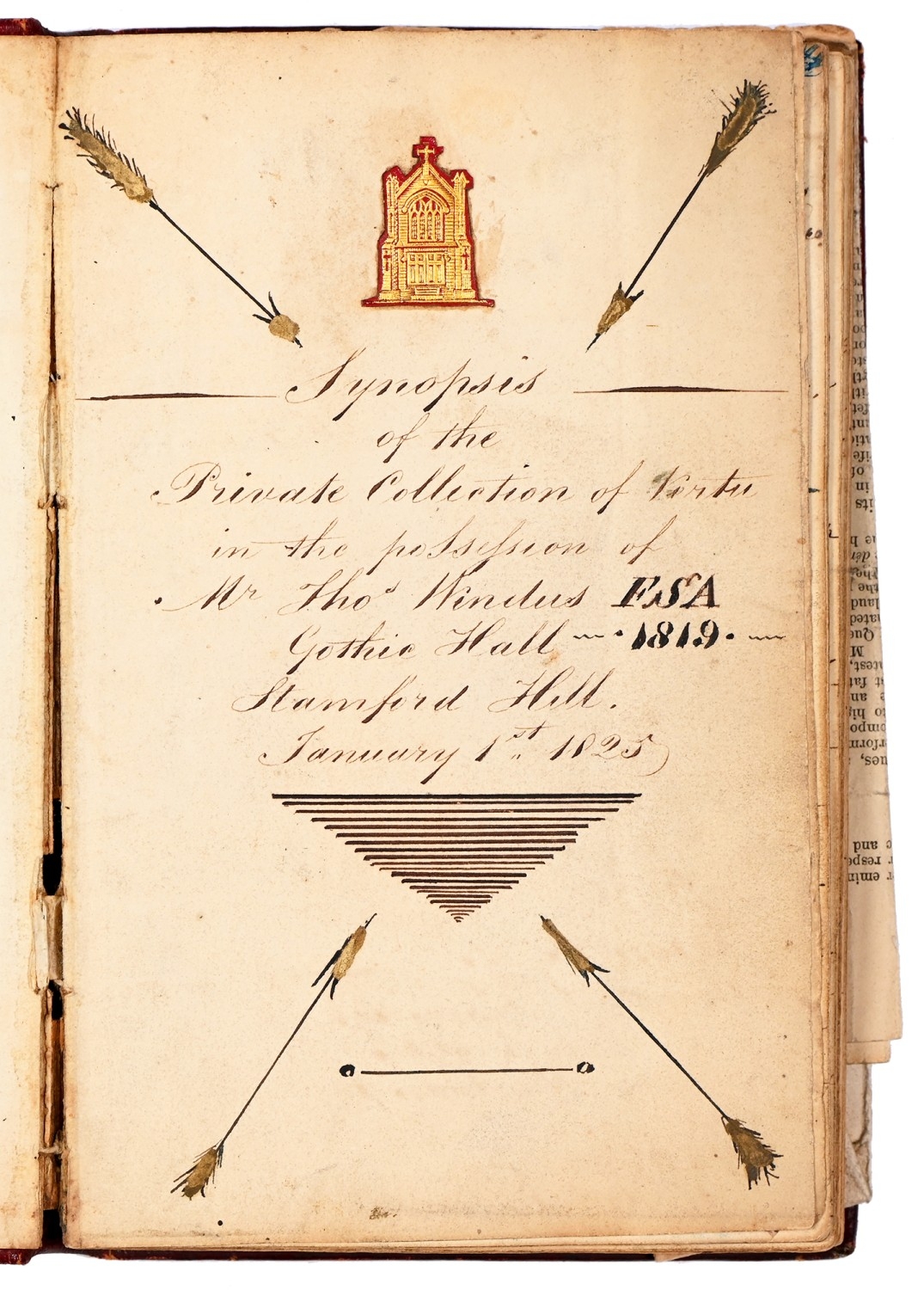 Collecting & The Wunderkammer. Thomas Windus FSA (1778-1854), of Gothic Hall, Stamford Hill, London, antiquarian, an expert on the Portland Vase, and Seneschal in the Noviomagan Society, his own autograph manuscript of his 'museum' collection, Synopsis of the Private Collection of Vertu in the possession of Mr Tho:s Windus FSA 1819/Gothic Hall/Stamford Hill/January 1st 1825, complete: [3], 70, [4], [1]pp, paginated, blanks 21-22, 42 & 59-67 also paginated, the catalogue comprising antiquities and curiosities, geology and natural history specimens, etc., the Index stating: 'Carvings in Ivory, D:o Mother o'Pearl, Chrystals, Grecian Pottery &c, Gems Rings &c, Silver & Gold Chasing, Carving in Wood, Gothic Furniture, Cabinets &c &c, Porcelain China &c, Coins, Medals &c antique and modern, Ancient & Curious Missals Books &c, Bronzes [...]'; the page following the index stating a collector's woe and destiny: expenditure and a spendthrift; tantalising provenances throughout the collection, including the princely collection of Lucien Bonaparte, the Colonna family of Rome, and others, notes include: 'Lost, stolen or strayed' (multiple times), 'Madame Tussaud has the Watch', 'A highly executed carved Triptich (sic) Altar much admired by Prince Albert', an Apostle spoon claimed - perhaps romantically - to have been Shakespeare's, a volume presented to the College of Arms, etc; the final part comprises a two page account of being an antiquary, another two pages a description of Gothic Hall, its architecture and history, contemporary maroon straight-grain morocco rolled in blind, the covers with four gilt tooled labels: the elevation of Gothic Hall - designed to house the museum itself, the Windus arms, his entwined monogram incorporating Mannerist figures, the crest to verso, marbled edges and endpapers, the author-collector's armorial bookplate to recto pastedown, printed on lavender paper, loosely-inserted illustrated Victorian periodical article on the collection, another sheet with an engraved elevation of Gothic Hall, 8vo