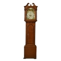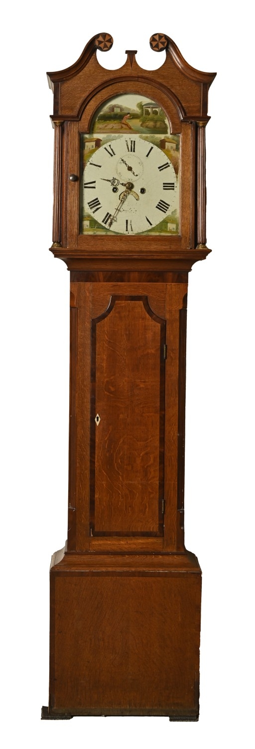 A Victorian oak and fruitwood eight-day longcase clock, break arched dial with date sector, subsidiary seconds ring, brass ringed winding squares and pierced hands, painted with an angler and rustic cottages, the hood with swan neck pediment and fluted pillars, 204cm h