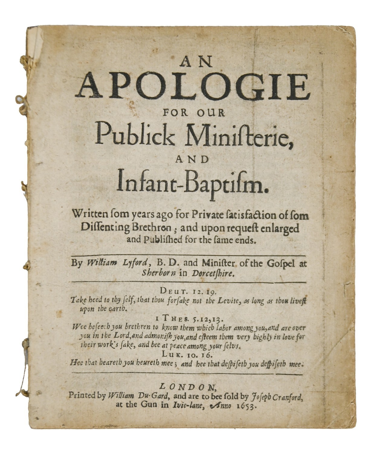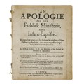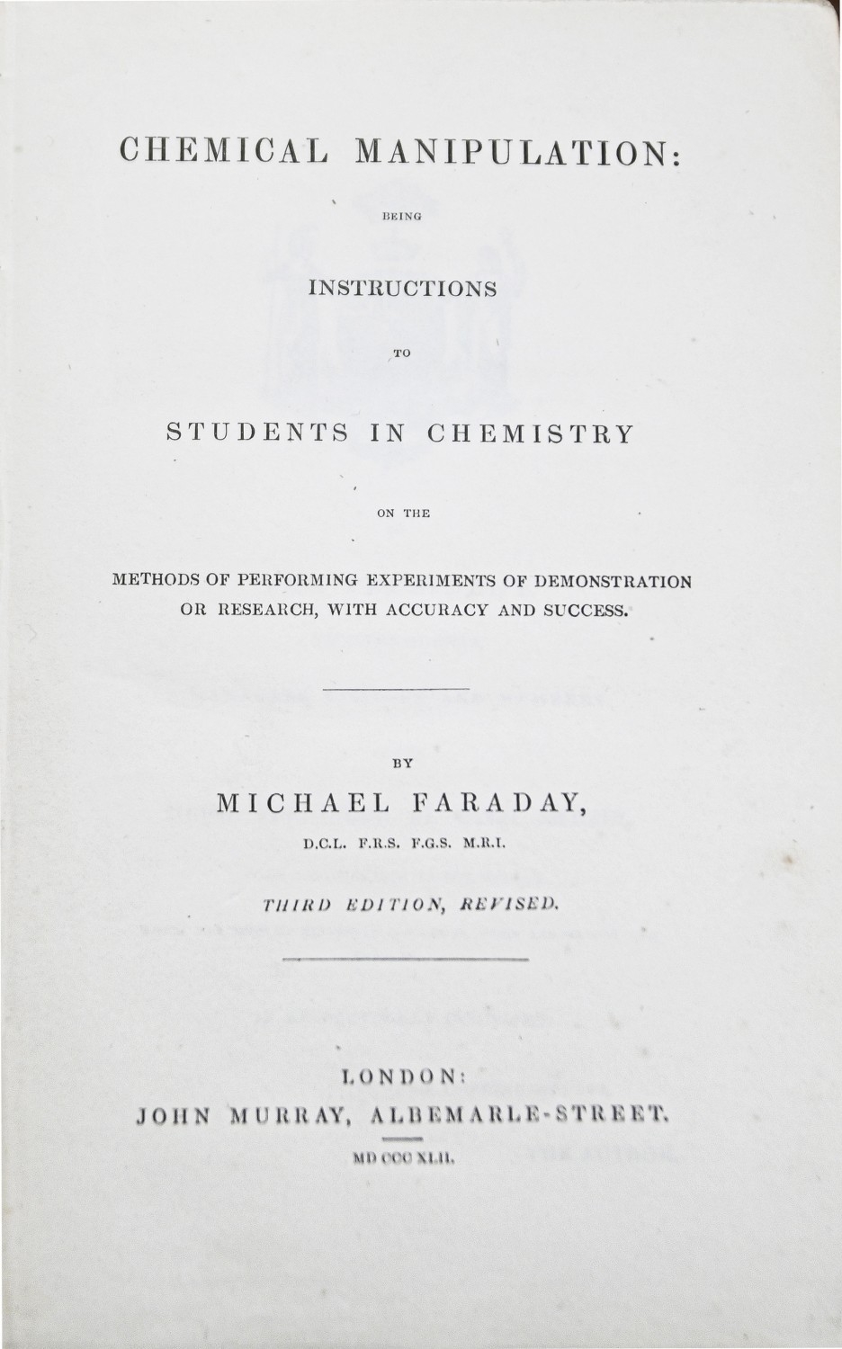 Antiquarian Books. Chemistry: Faraday (Michael, DCL, FRS, FGS, MRI), Chemical Manipulation: Being Instructions to Students in Chemistry [...], third edition, London: John Murray, 1842, half-title, in-text illustrations and diagrams, rear with publisher's catalogue, original publisher's cloth, binder's ticket, front cover off and spine split, uncut, 8vo; Commonwealth Tract; Nonconformity: Lyford (William, Minister of the Gospel at Sherborn (sic; Sherborne)), An Apologie for our Publick Ministerie and Infant-Baptism (sic). Written some years ago for Private satisfaction of some Dissenting Brethren; and upon request enlarged and Published for the same ends (sic), first edition, London: Printed by William Du-Gard, and are to bee sold by Joseph Cranford (sic), 1653, [vi], 46pp, plus original recto blank, disbound, 4to, (2)