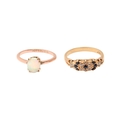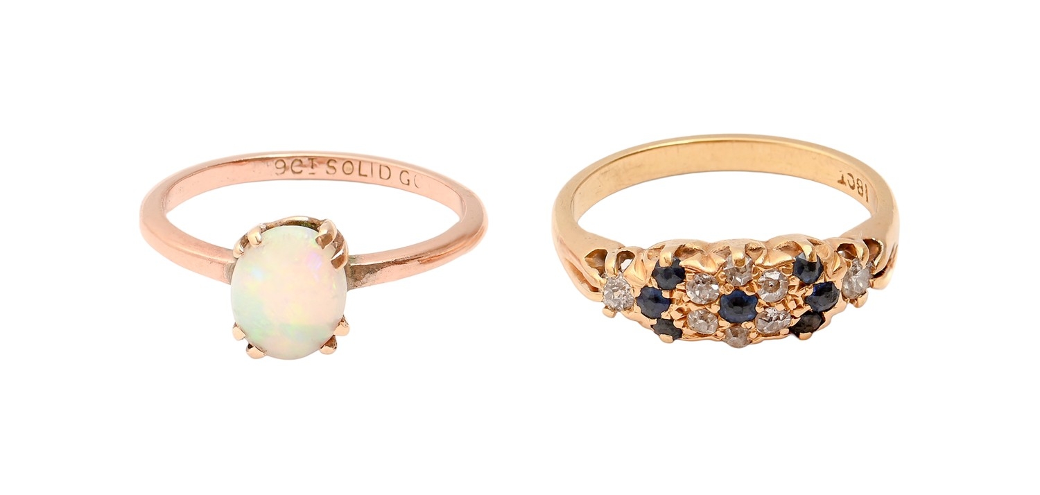 A sapphire and diamond ring, in gold marked 18ct, 3.8g and an opal ring, in gold marked 9ct, 1.4g, size K (2)