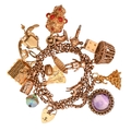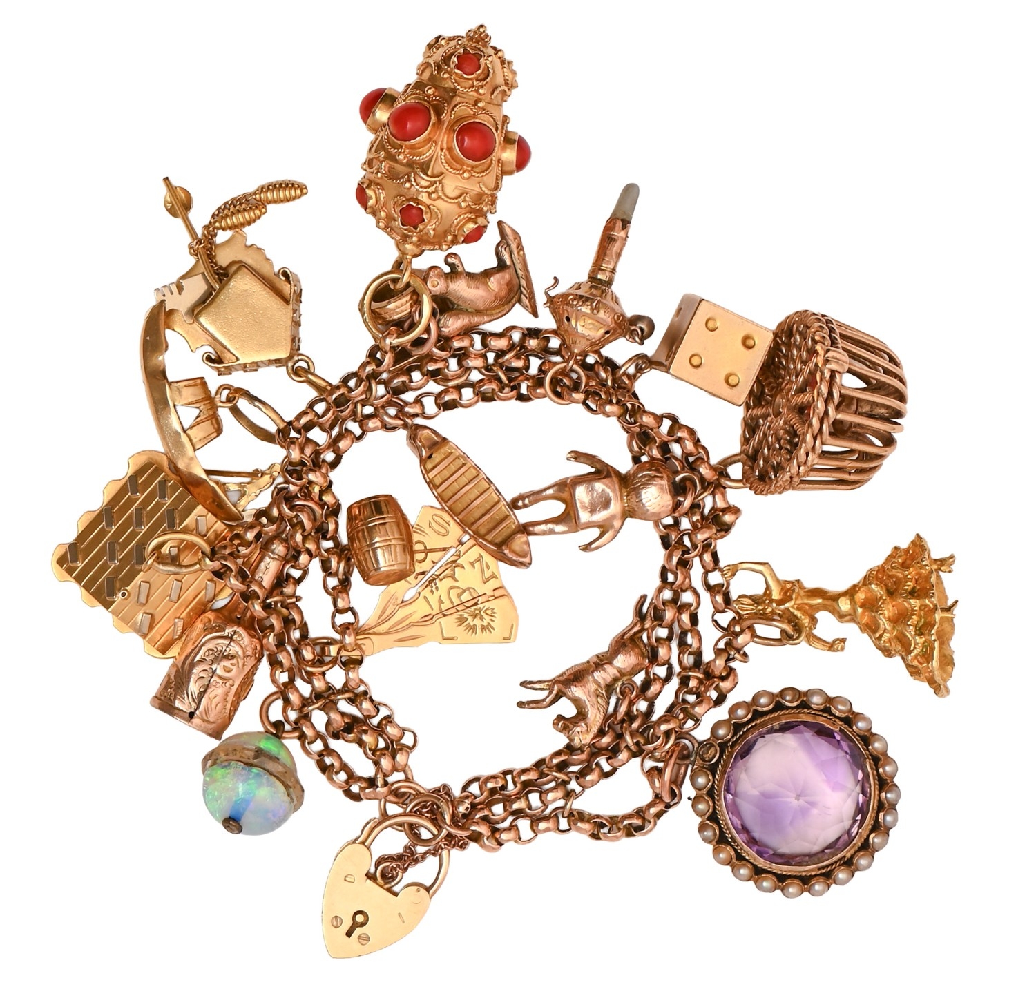 A gold charm bracelet, adapted from a Victorian gold muff chain, with 9ct gold padlock and a collection of gold charms, including a Victorian amethyst and split pearl pendant, Flamenco dancer, lobster pot and Italian coral-set lantern, approx 18cm l