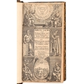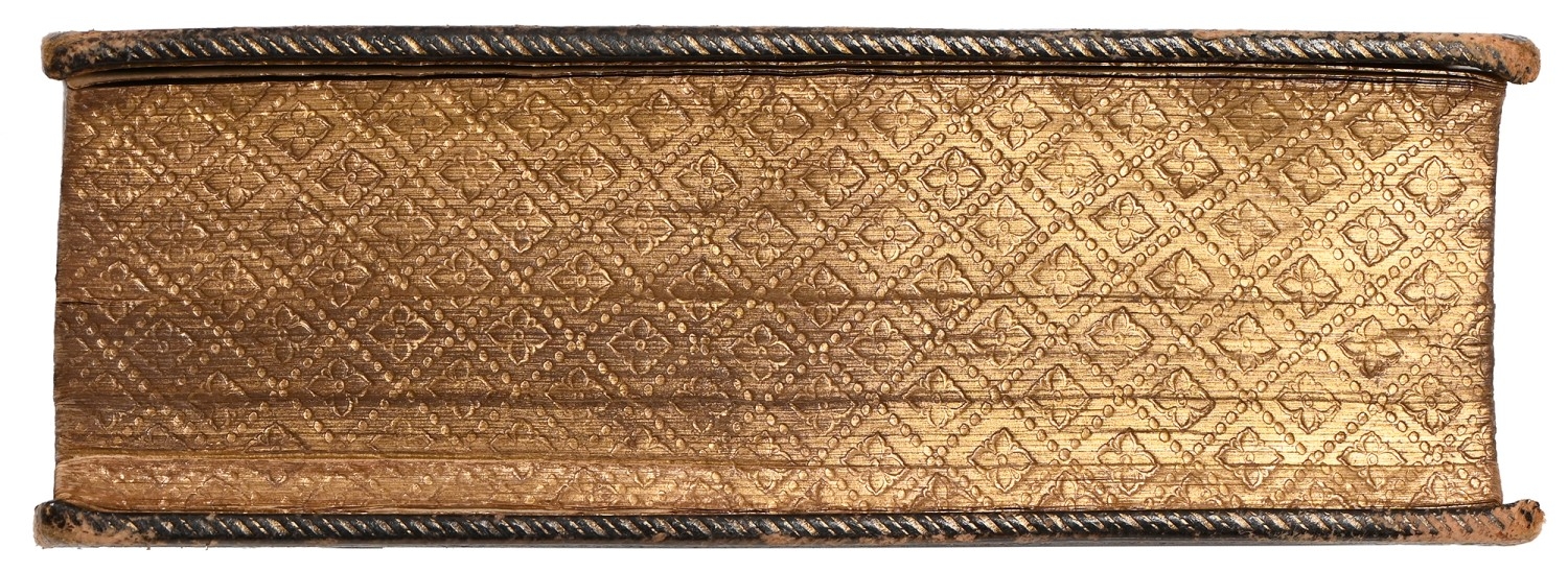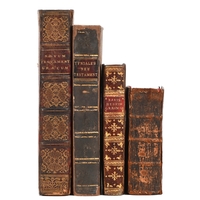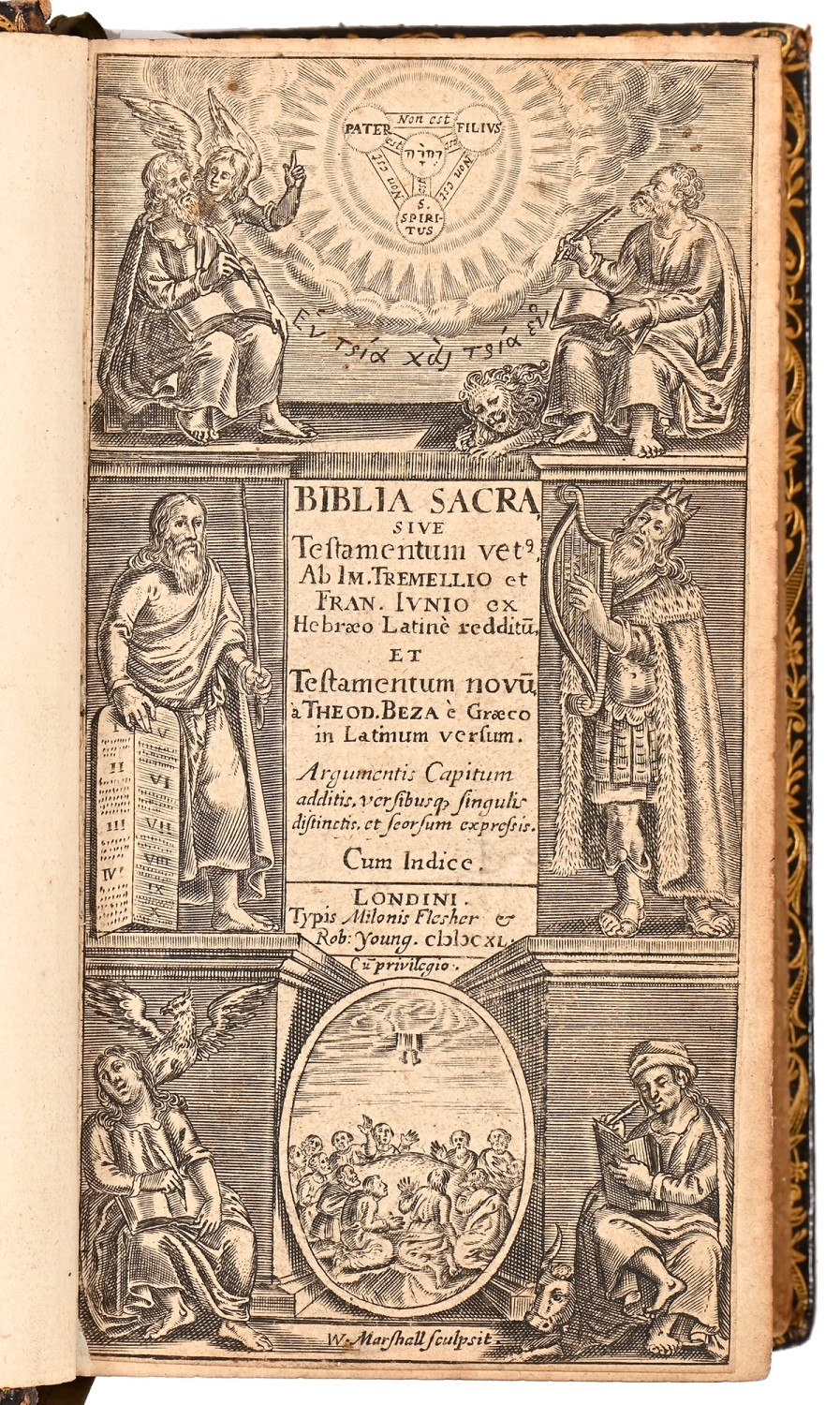 Bible. Tremellius (Immanuel, translator), Junius (Franciscus, the Elder, translator), & Beza (Theodore, translator), Biblia Sacra, sive Testamentum [...], two parts, London: Miles Flesher & Robert Young, 1640, title page engraved by William Marshall, divisional New Testament letterpress title, double-column, black-ruled, [bound with] The Book of Common Prayer, London: John Bill and Christopher Barker, 1674, double-column, [&] The Whole Booke (sic) of Psalmes (sic), London: Printed by G.M. for the Companie (sic) of Stationers, 1646, typographic title, double-column, [&] A New Version of the Psalms of David, London: Samuel Bagster and Sons, n.d. [c. 1830], double-column, the earlier printed devotionals trimmed a little close, occasionally touching &/or affecting running title or marginal notation, fine early 19th c English binding of black morocco, elaborately blocked, tooled and lettered in gilt, further gilt gauffered edges, marbled endpapers, 12mo
