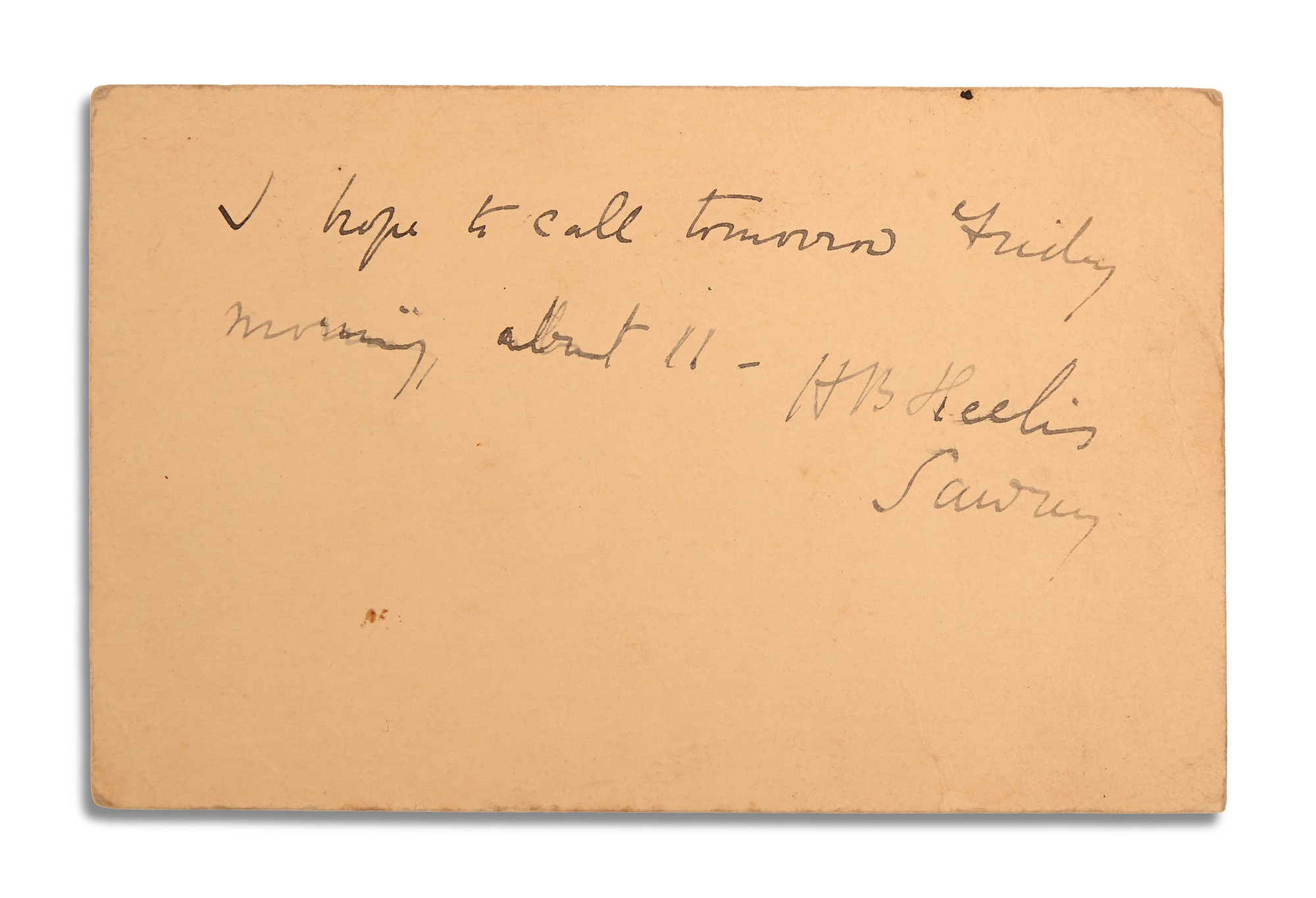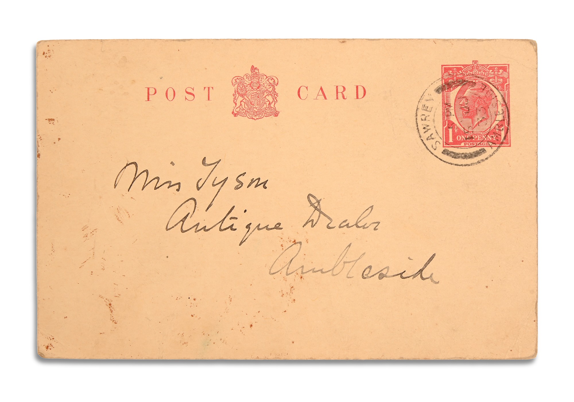 9 x 14cm, two lines, "I hope to call tomorrow Friday morning about 11" and addressed Miss Tyson Antique Dealer Ambleside