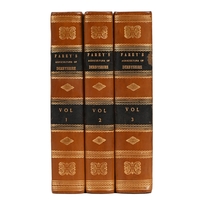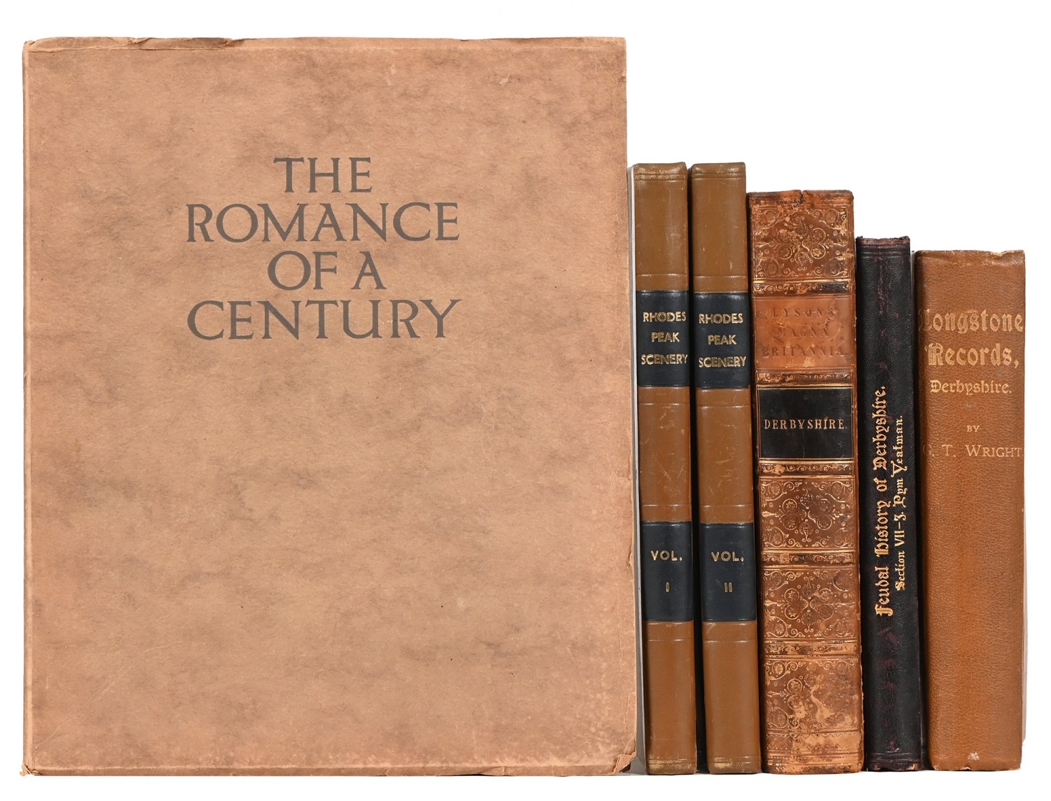 Derbyshire. Rhodes (Ebeneezer), Peak Scenery, or Excursions in Derbyshire: Made Chiefly for the Purpose of Picturesque Observation, four parts bound in two volumes, London: Printed for the Author, and Published by Longman, et al, 1818-23, four letterpress title-pages, named-view engravings in proof state, mid-20th c brown leather over cloth boards, 4to; Lysons (Rev. Daniel) & (Samuel), Derbyshire, volume V from Magna Britannia, London: T. Cadell and W. Davies, 1817, half-title, folding county map, folding and full-page plates, contemporary calf over boards, marbled edges and endpapers, contemporaneous armorial bookplate: Charles William Packe of Prestwold Hall (1792-1867), 4to; Wright's Longstone Records, presentation copy from the author, Bakewell: Benjamin Gratton, 1906, cloth, 4to; Pym Yeatman; Bemrose, folio, (6)