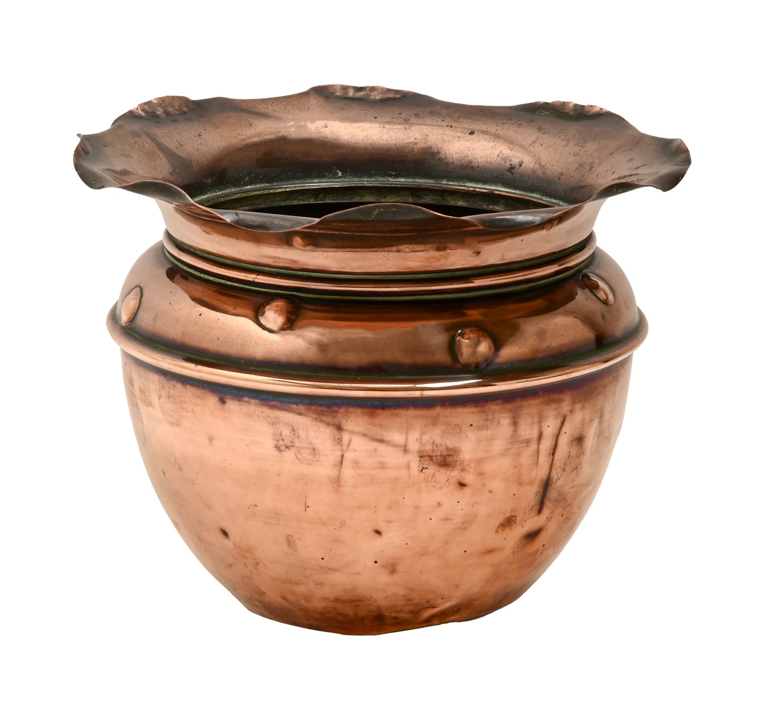 An Arts and Crafts style copper jardiniere, early 20th c, flared rim, 18cm h