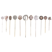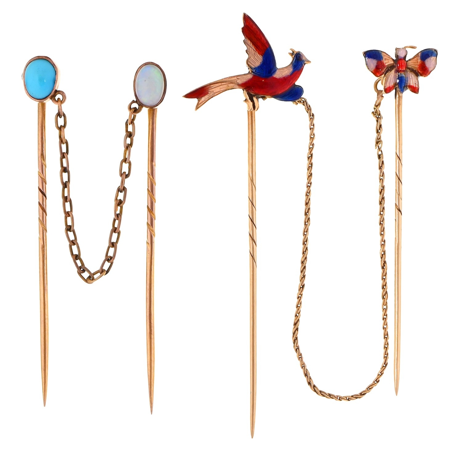 Two Victorian gold and enamel or gold and turquoise and opal pin suites, the chains of gold, bird head 17mm w, 4.7g