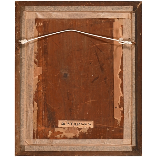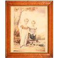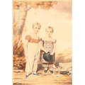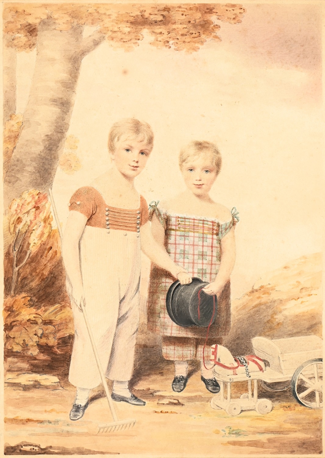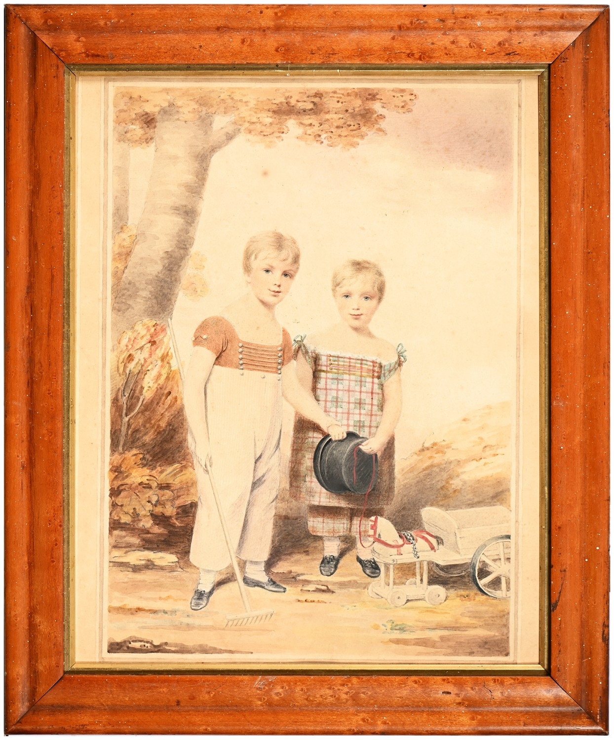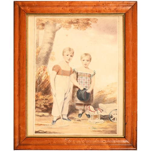 English School, 19th century - Portrait of Two Children with Rake or Pull-along Horse, watercolour, 34 x 24cm, laid down on the original mount, maple frame