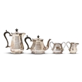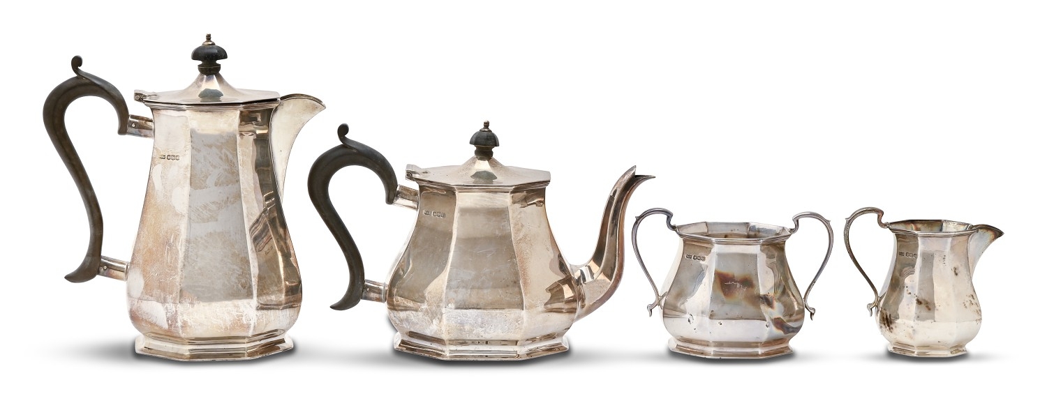 A George V silver four-piece octagonal tea service, lidded jug 21cm h, by Mappin & Webb Ltd, Sheffield 1921 and 1922, 50oz 18dwt