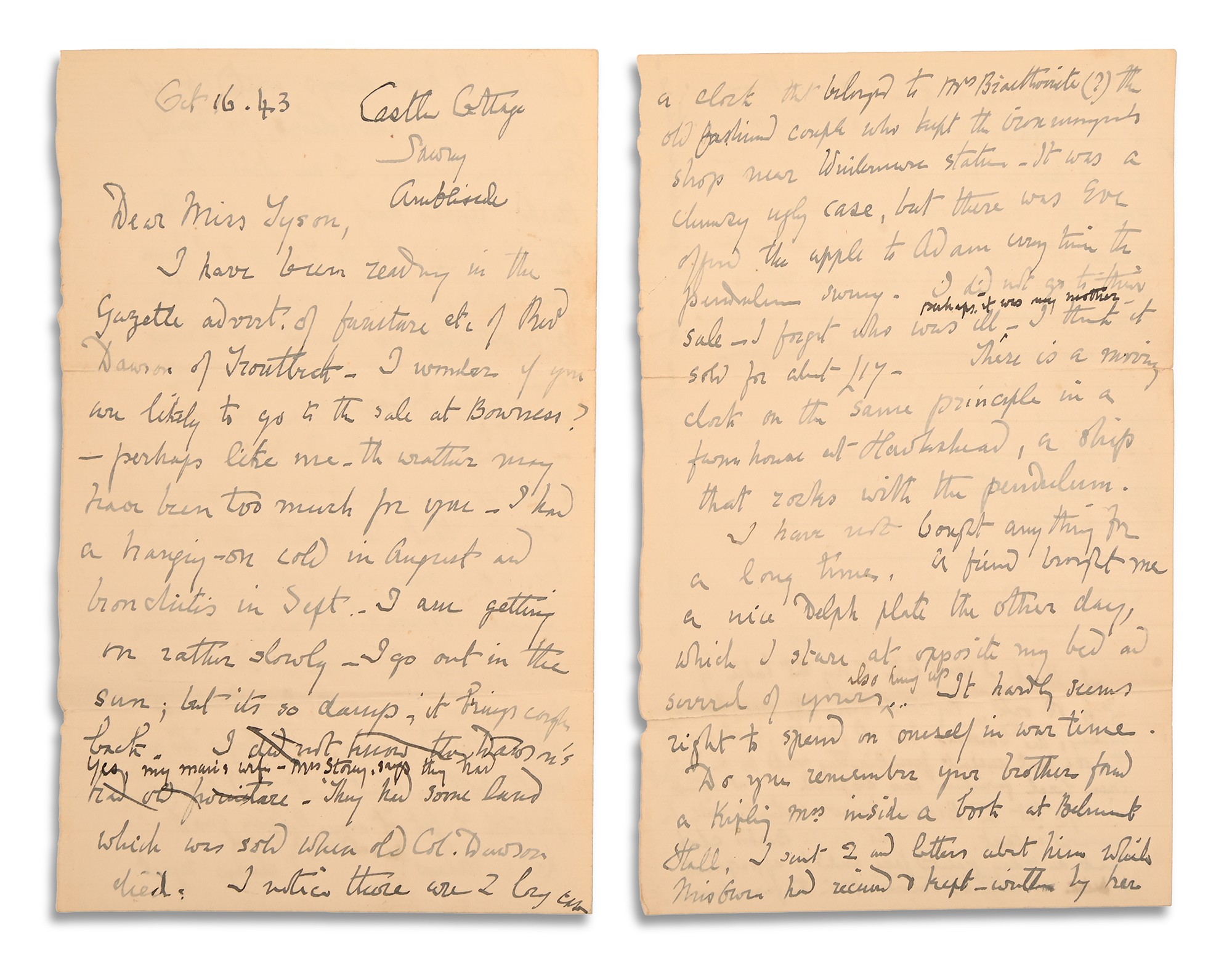 "I have been reading in the Gazette advert. of furniture etc of Revd Dawson of Troutbeck. I wonder if you are likely to go to the sale at Bowness? Perhaps like me the weather may have been too much for you - I had a hanging-on cold in August and bronchitis in September. I am getting on rather slowly - I go out in the Sun... I did not know that Dawsons had old furniture [two lines crossed out] my man's wife - Mrs Storey* says they had old furniture [and] some land which was sold when old Col Dawson died. I notice there are two longcase clocks. I have always wanted to get one with local connections for Troutbeck Park farm house. I'm afraid the Barber requires daily winding as the other is specified to be 7 days and I have one Barber, in another house; and there is unfortunately no panelling at the Park so a nice clock by another local maker in a-case would not come amiss. I don't understand "carved oak" it makes one think of the horrid carving that is sometimes added by well meaning people like Clara Brown's father. Whatever is the refectory table? The Franks have some fine oak; I don't know about Revd Dawson. Perhaps it's not worth bothering about. It could have been possible to get it away. B Dixon* goes to Kendal Fridays and could bring to Sawrey. I always regret a clock that belonged to Mrs Braithwaite* the old fashioned couple that kept the ironmonger's shop near Windermere station. It was a clumsy ugly case, but there was Eve offered [sic] the apple to Adam every time the pendulum swung. I did not go to their sale - I forgot who was ill - perhaps it was my mother - I think it sold for about £17. There is a moving clock on the same principle in a farm house at Hawkshead, a ship that rocks with the pendulum.