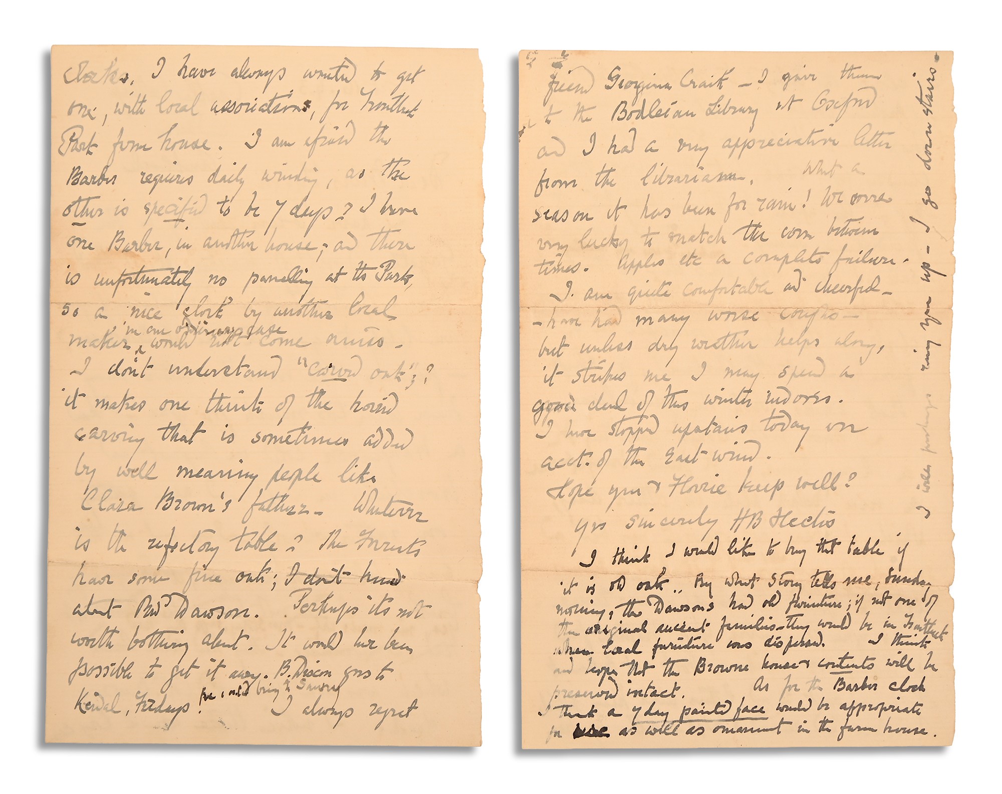 Do you remember your brother found a Kipling mss inside a book at Belmount Hall. I sent 2 letters about him which Miss Owen* had received & kept - written by her from Georgiana Craik*. I gave them to the Bodleian Library at Oxford and I had a very appreciative letter from the librarian. What a season it has been for rain! We are very lucky to snatch the corn between times. Apples etc a complete failure. I am quite comfortable and cheerful - I have had many worse coughs but unless dry weather keeps away it strikes me. I may spend a good deal of this winter indoors. I have stopped upstairs today on acct. of the east wind. Hope you & Florrie keep well?" [with postscript] "I think I should like to buy that table if it is oak. By what Storey tells me, Sunday morning, the Dawsons had old furniture; if not one of the original ancient families they would be in Troutbeck where local furniture was despised. I think and hope that the Browne house & contents will be preserved intact. As for the Barber clock think a 7 day painted face would be appropriate for as well as ornament in the Arm House. I will perhaps ring you up - I go down stairs"