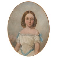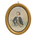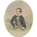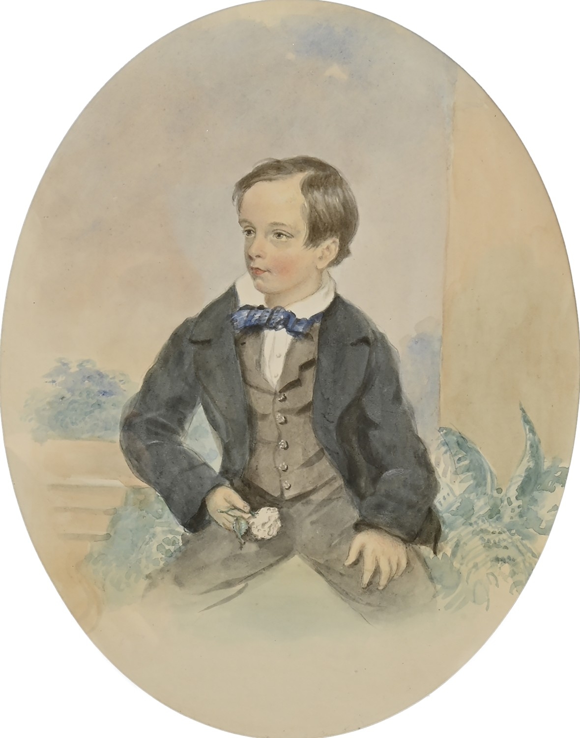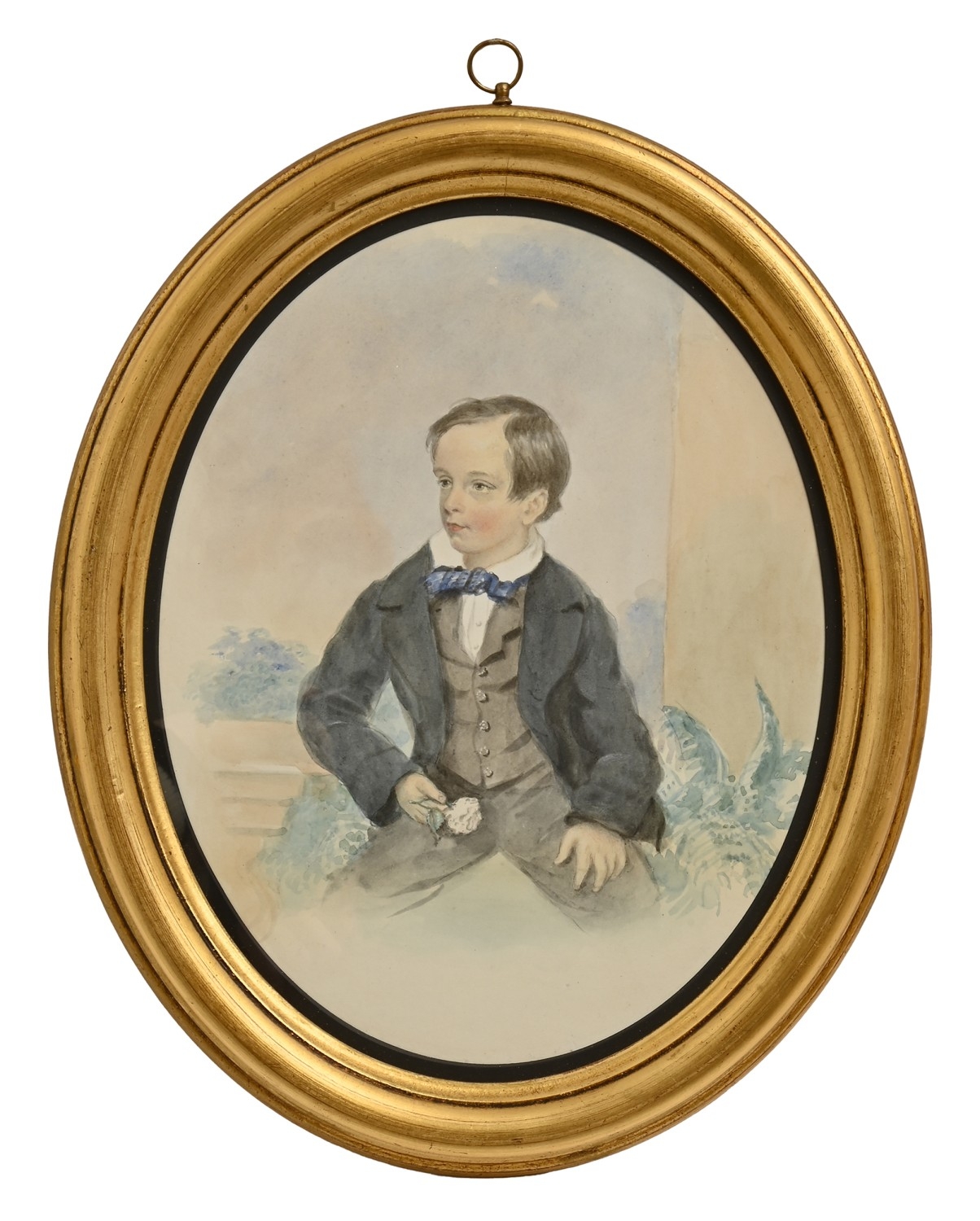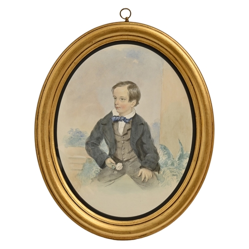 English School, 19th century - Portrait of a Boy holding a Carnation, watercolour, oval 27.5cm