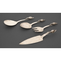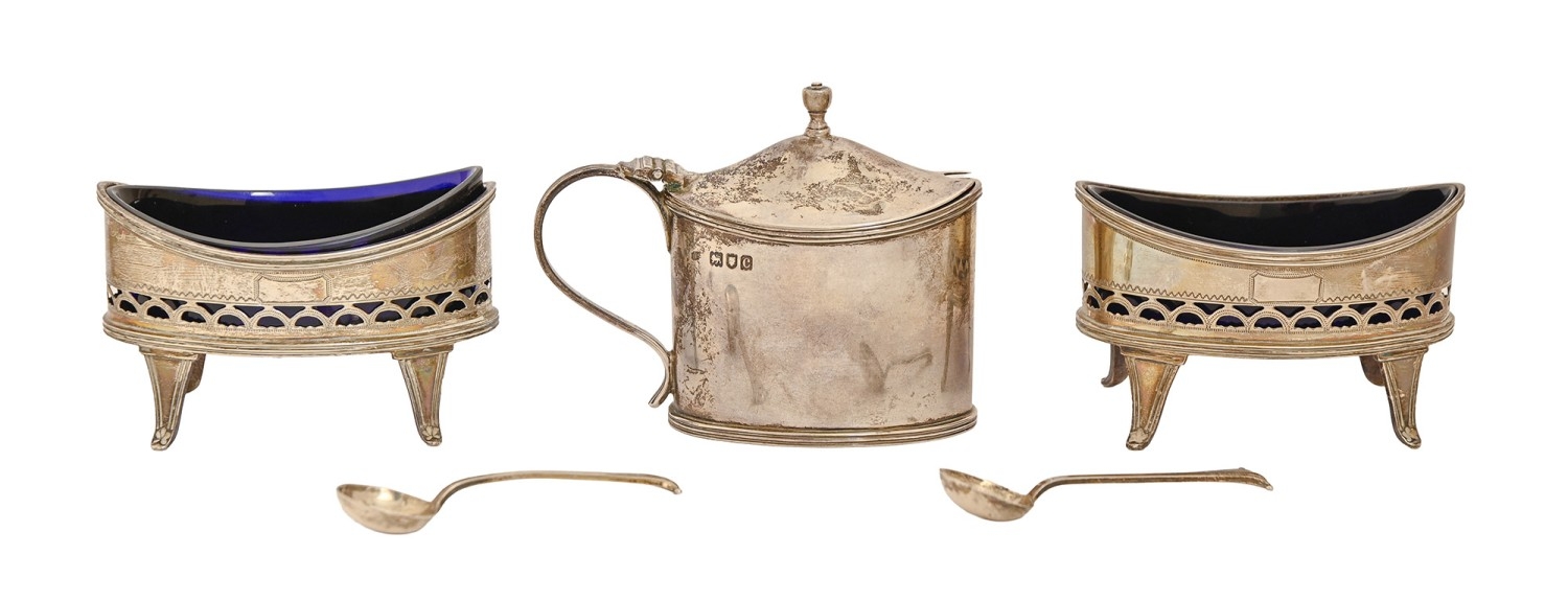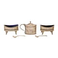 A pair of Victorian pierced silver salt cellars, in Neoclassical style, blue glass liners, 9cm w, by Thomas Bradbury & Sons Ltd, London 1898, and spoons and a silver mustard pot, by another, same date, 7oz 14dwt (3)