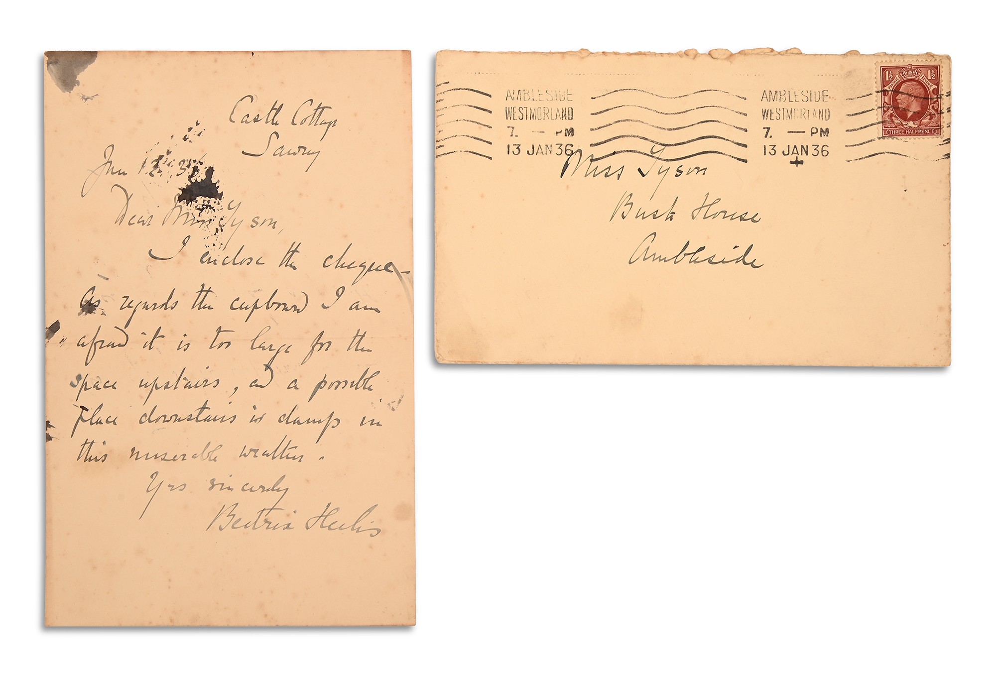 “I enclose the cheque as regards the cupboard, I am afraid it is too large for the space upstairs and a possible place downstairs is damp in this miserable weather."