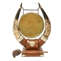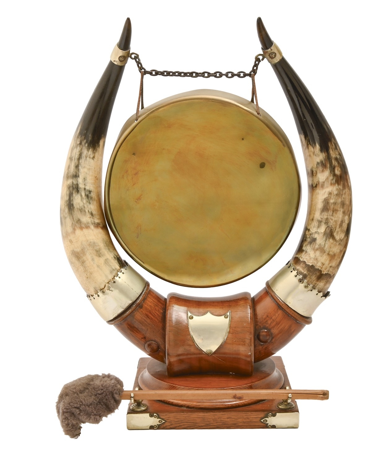 A Victorian brass dinner gong, mounted on oak stand, between a pair of horns, 47 x 35cm, associated beater