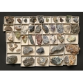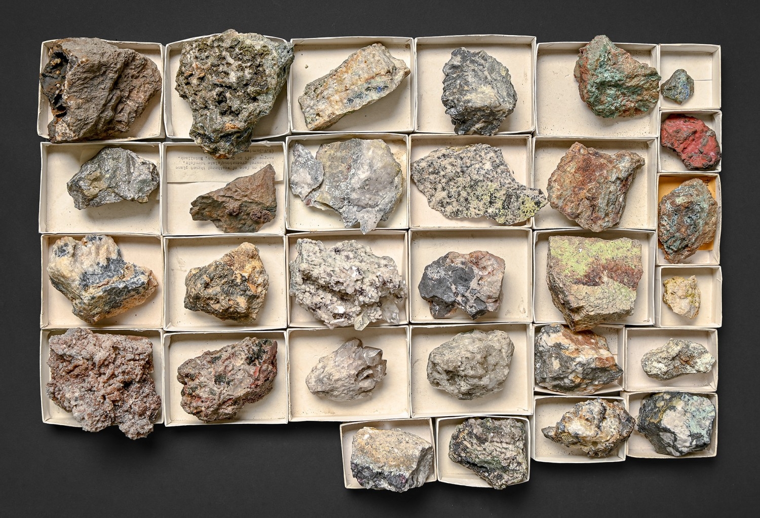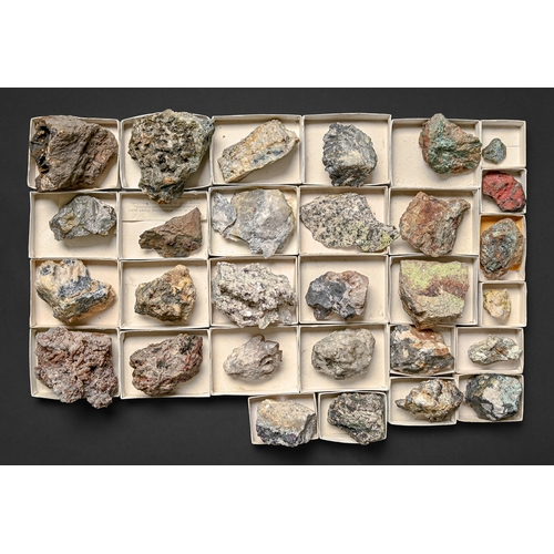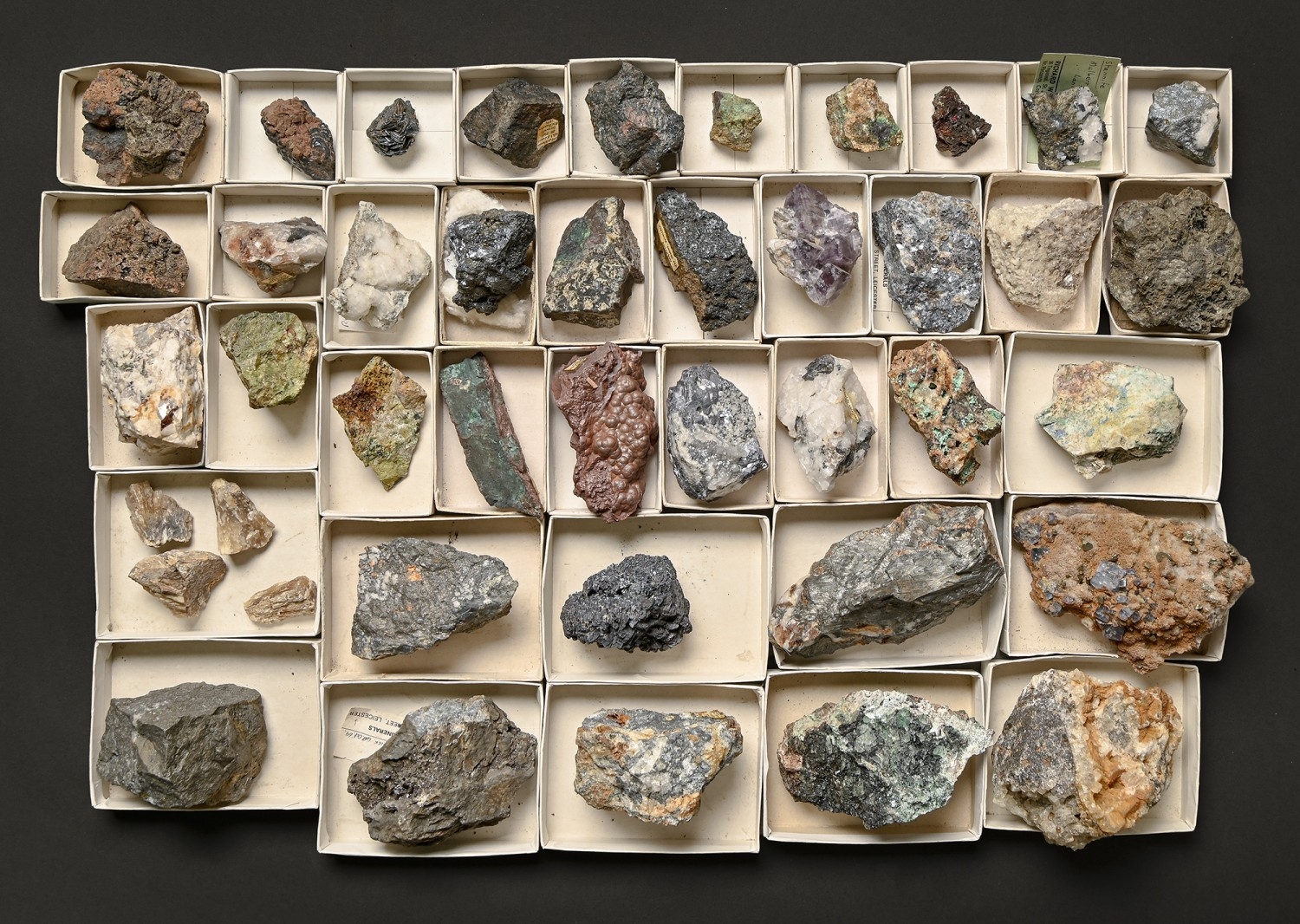 Cornish and other British minerals. Chrysocolla and Malachite with Carpentem, St Erth, 83mm, Jamesonite, "from the small mine half mile SW of Trerose Farm", Port Isaac, 116mm, Aurichalcite with Geothite in Quartz, Roughton Gill Mine, Caldbeck Fells, Cumberland, 73mm, others including Hematite, Sharkham Point, Devon, Blende and Dolomite, Force Crag Mine, Keswick, Paratacamite on Chalcocite, Zawn Brinney Lode, Levant Mine, St Just, Cornwall, Scheelite and Wolfram, Carrock Mine, Caldbeck Fells, Cumberland and Linorite, Pemberthy Croft, St Hilary, Cornwall, Harker Collection labels (68)