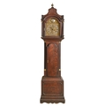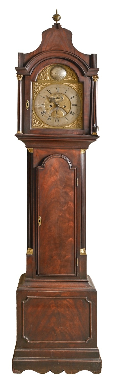 A George III mahogany longcase clock, John Mason, Doncaster, the 8-day movement with break arched brass dial, having matted centre, date sector and subsidiary seconds ring, convex signature disc and mask and dolphin spandrels, brass mounted and fluted pillars and pilasters, moulded door and panelled base, pendulum with brass fob, 219cm h