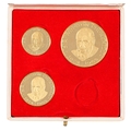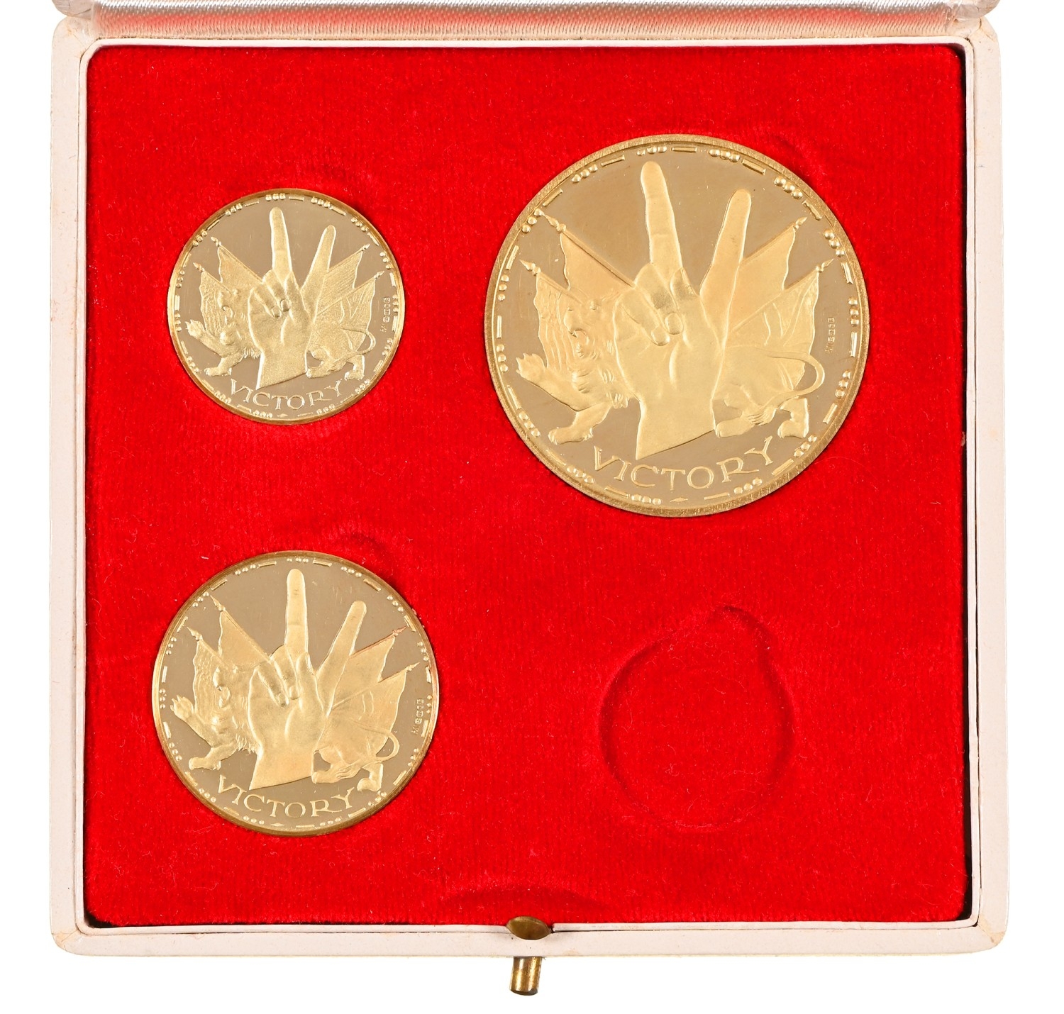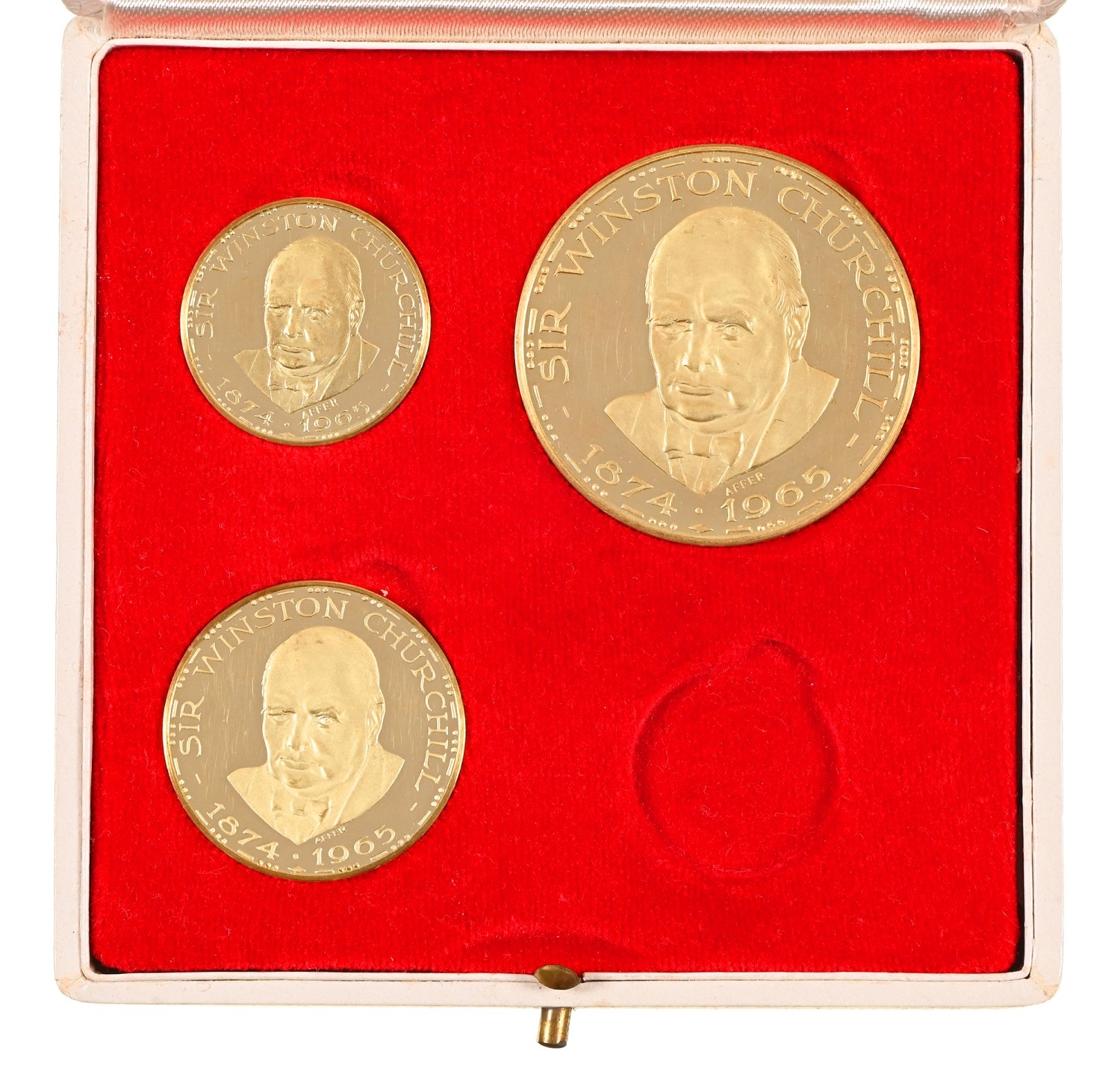 Sir Winston Churchill. A set of three 18ct gold commemorative medals, 40mm diam and smaller, by Metalimport Ltd, London 1965, with certificates, 53.2g