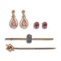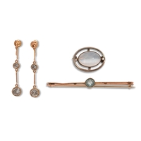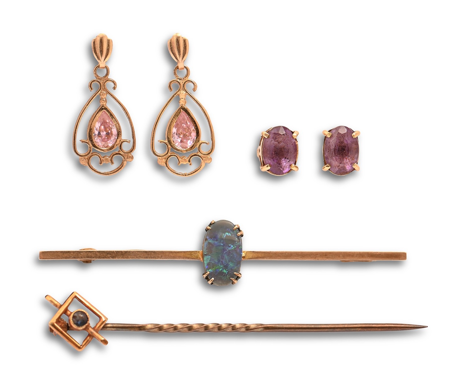 A black opal bar brooch, in gold, 5.4cm l, marked 9ct, a gold stick pin with sapphire terminal, early 20th c, marked 15ct and two pairs of gem set 9ct gold earrings, 6g (6)