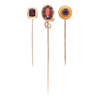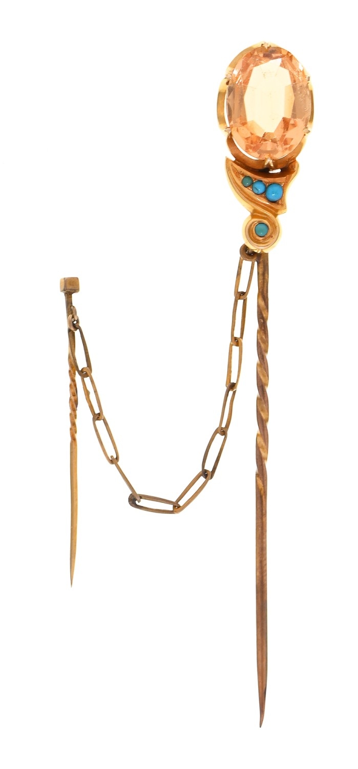 A Victorian gold stickpin, with citrine and turquoise terminal and chain, head 22mm, 3.5g