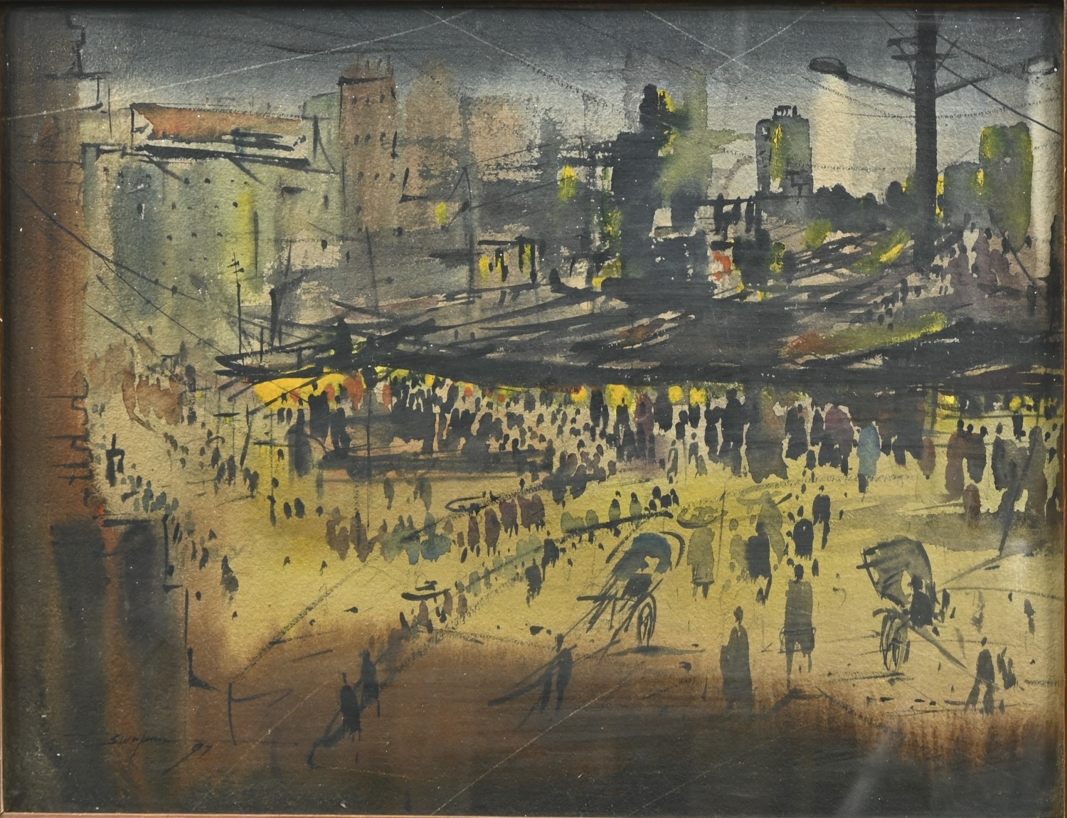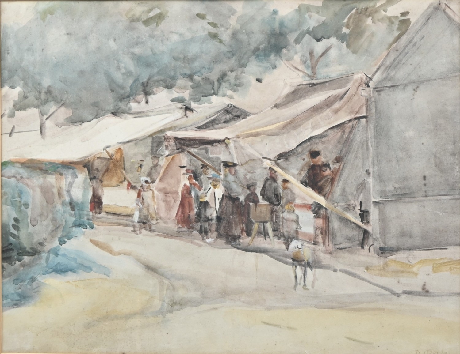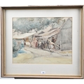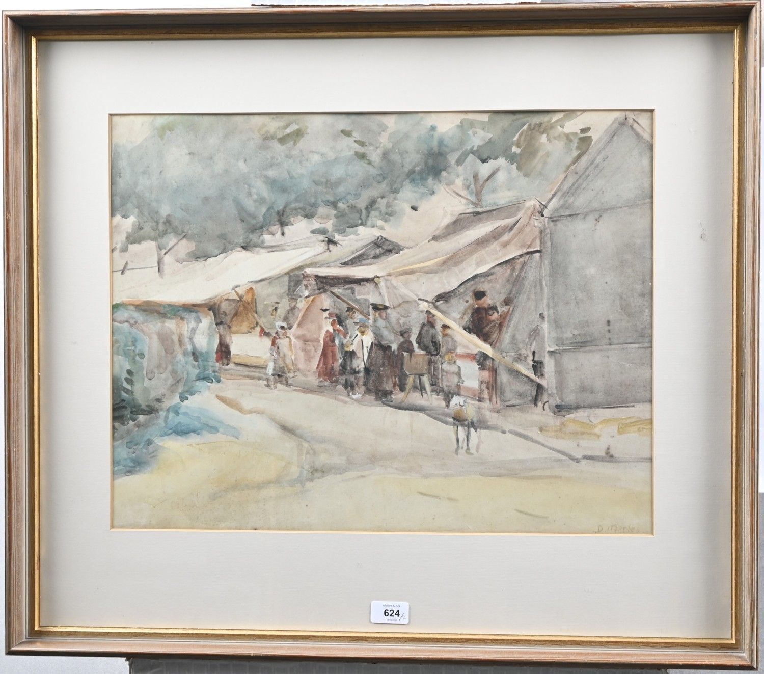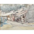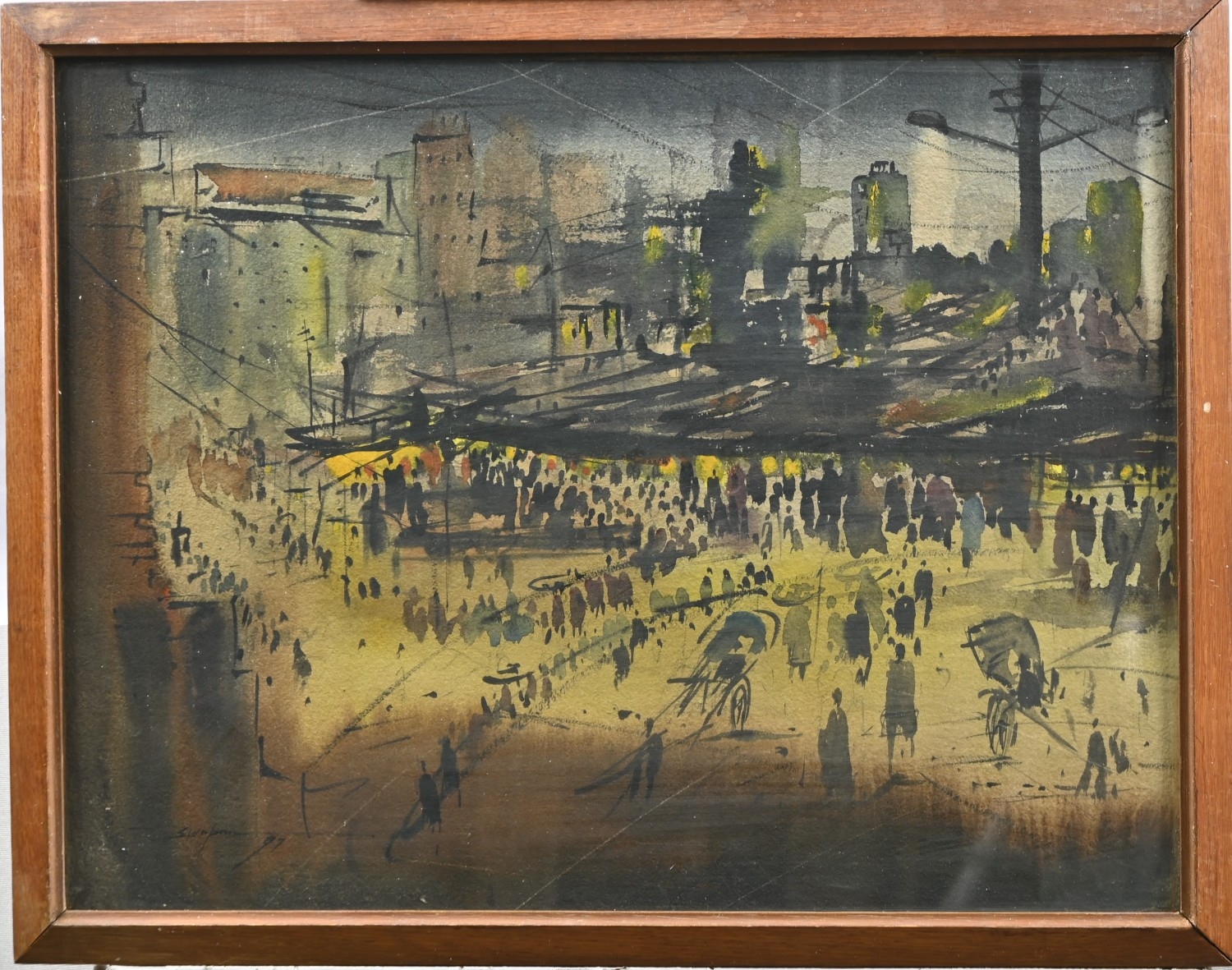D. Meeles, late 20th century - Market Scene, signed, watercolour, 42 x 55cm; Swap**, Asian Artist, late 20th century - Busy Street Scene, signed and dated 97, watercolour with pen-and-ink, 41.5 x 54cm, (2)