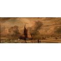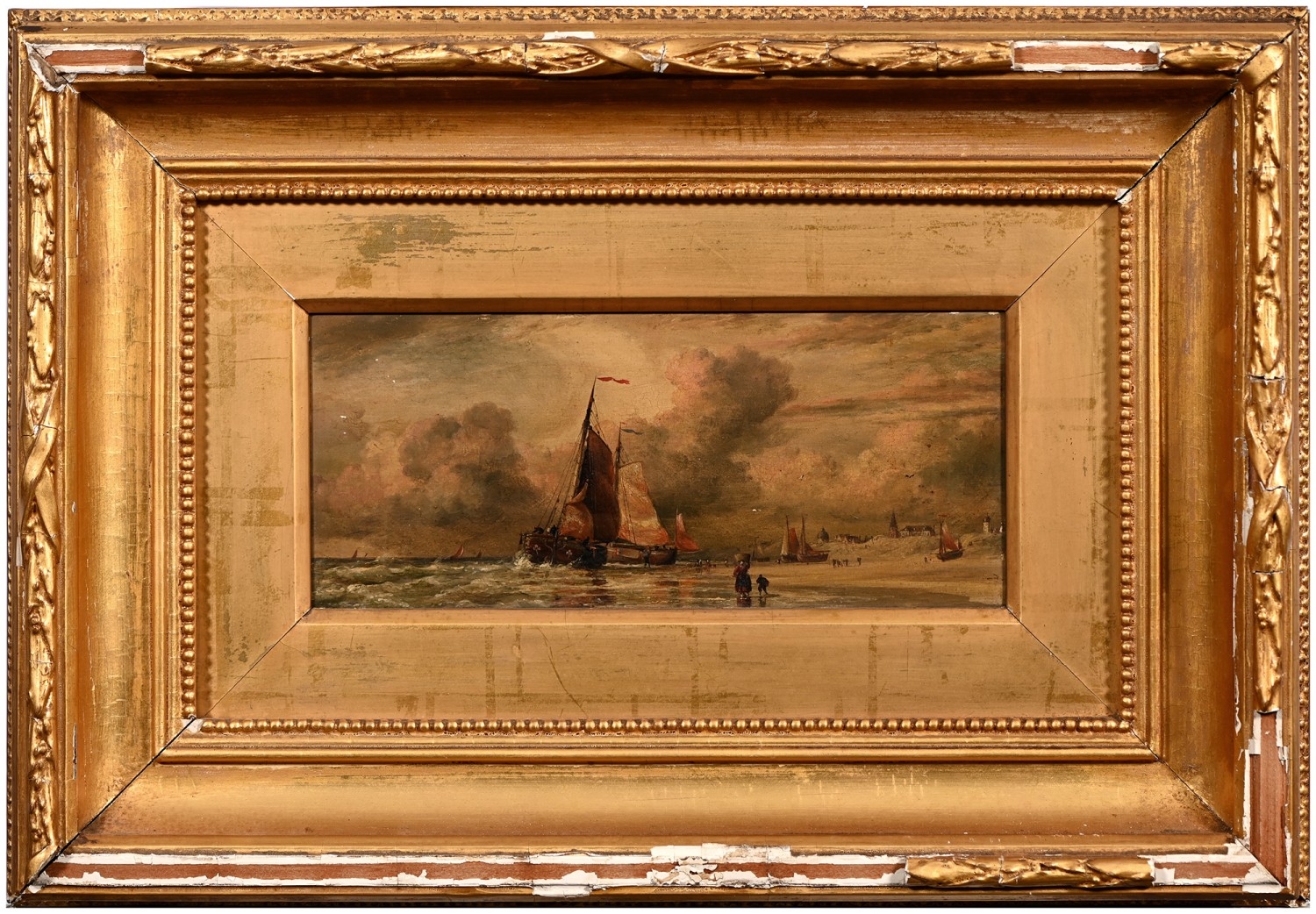 Attributed to George Elgar Hicks RA - Schooners on the Shore, the background with figures, a church, a lighthouse and further buildings, attributed and inscribed verso, oil on mahogany panel, supplied by Brown of High Holborn, stamped, 12 x 27.5cm