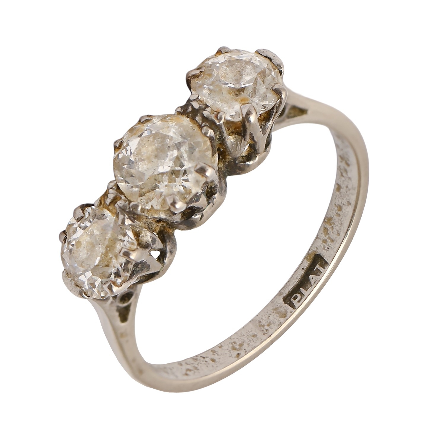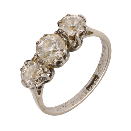 A diamond ring, with three round old cut diamonds, in platinum, marked PLAT, size O
