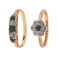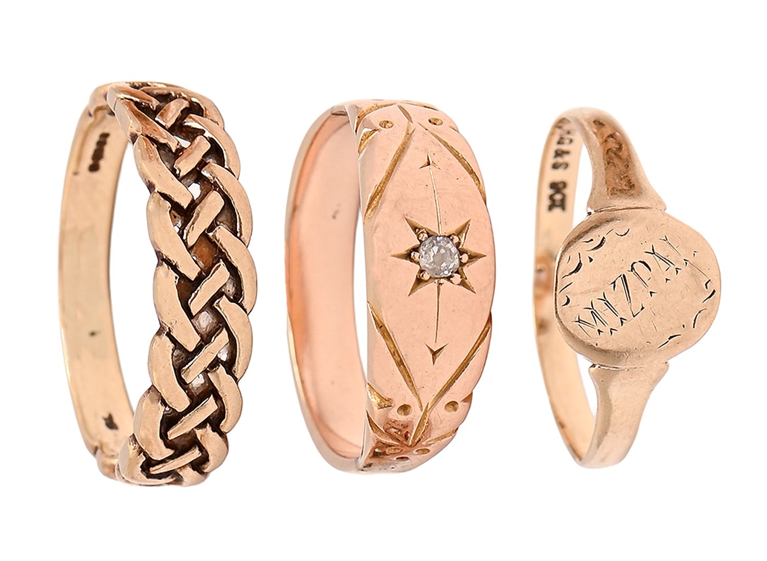 Three gold rings, one gypsy set with diamond, 5.5g, one distorted, the other K, M