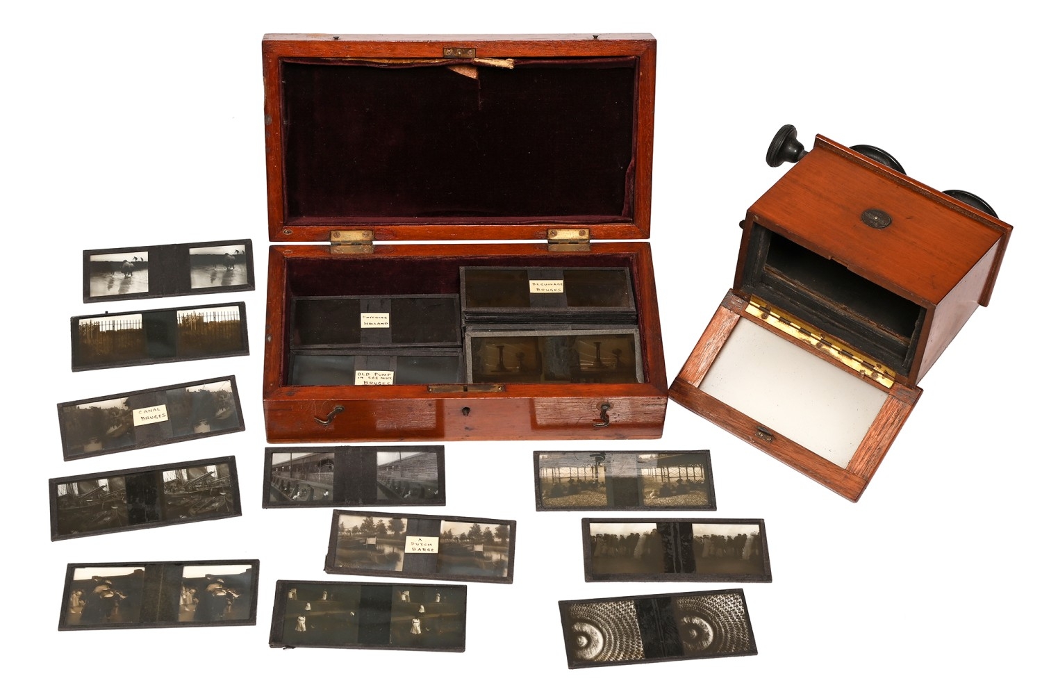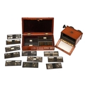 A French mahogany stereoscope, the Stereolette c1900, 4x10 glass slides and various contemporary glass slides, in a mahogany box