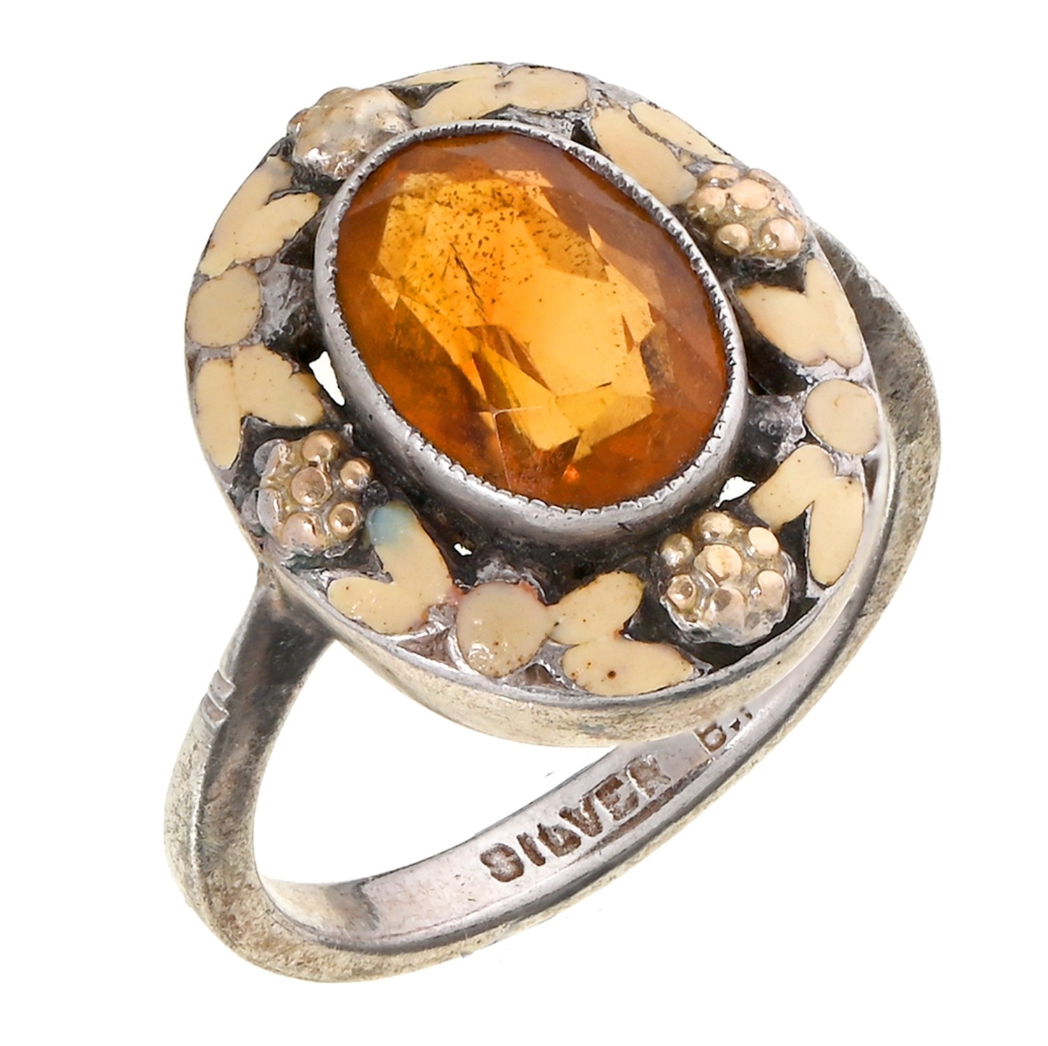 A citrine, silver and yellow enamel ring maker’s mark and SILVER, 3.8g, size J