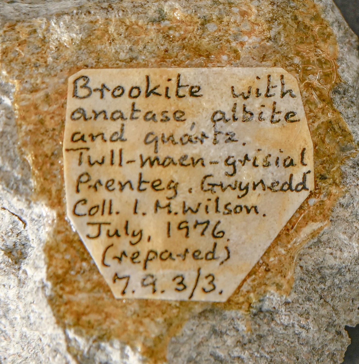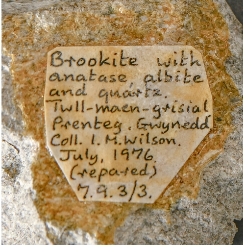Brookite with Anatase, Albite and Quartz, Twll Maen Grisial, Prenteg Quinette, 64mm, Harker Collection label