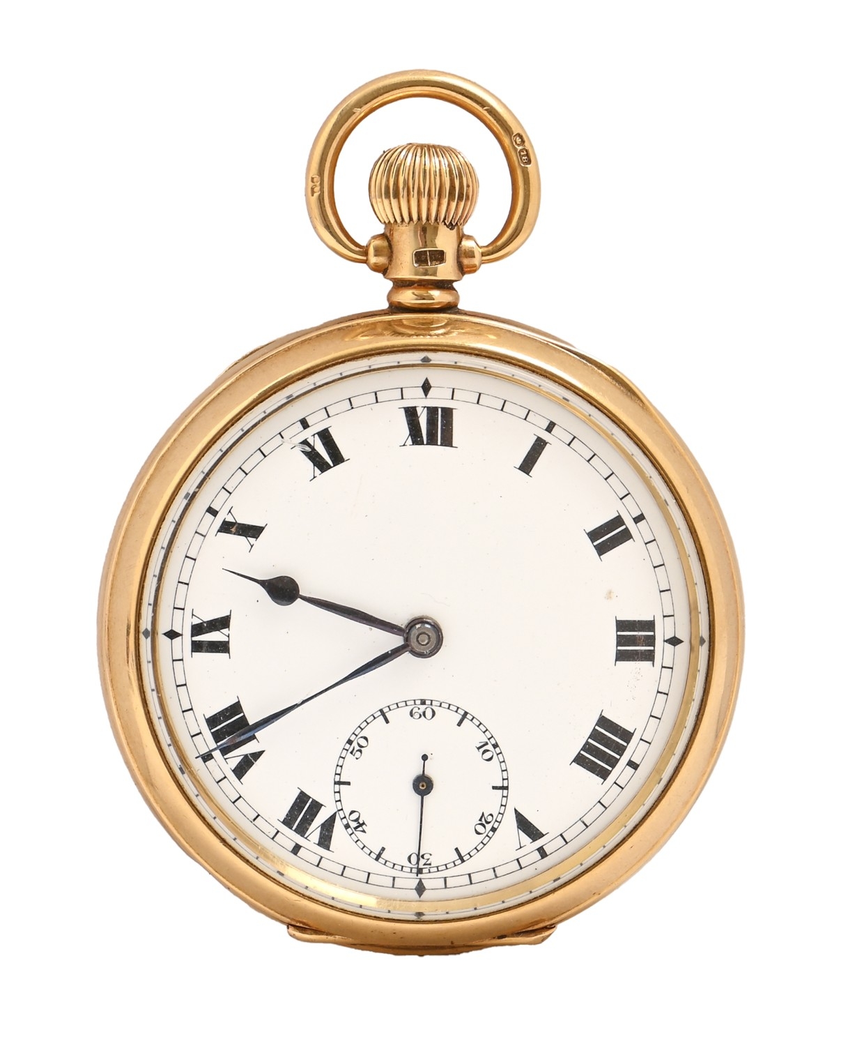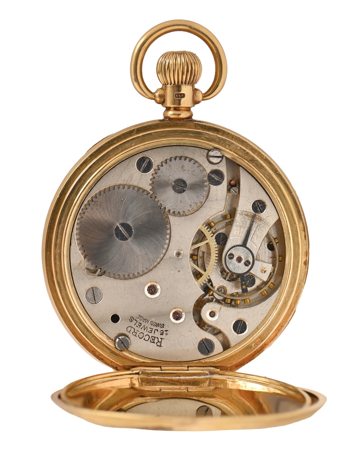 An 18ct gold keyless lever watch, with Record movement, in plain case with gold cuvette and bow, 50mm diam, Birmingham 1920, 96g